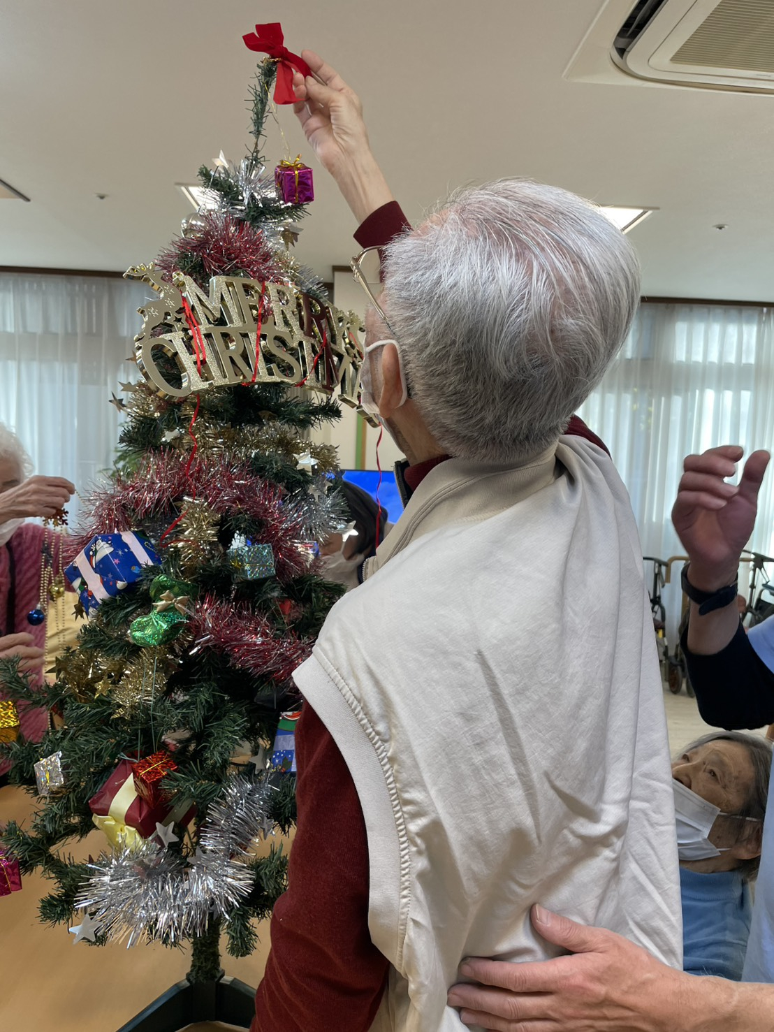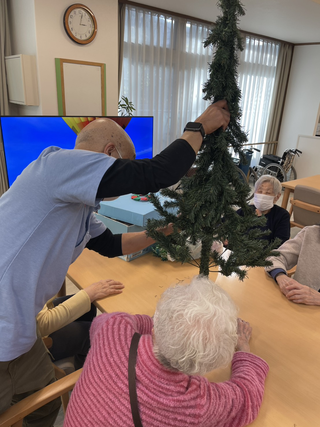 本日はレクとレクの合間の時間にクリスマスツリーの飾り付けを行いました!
