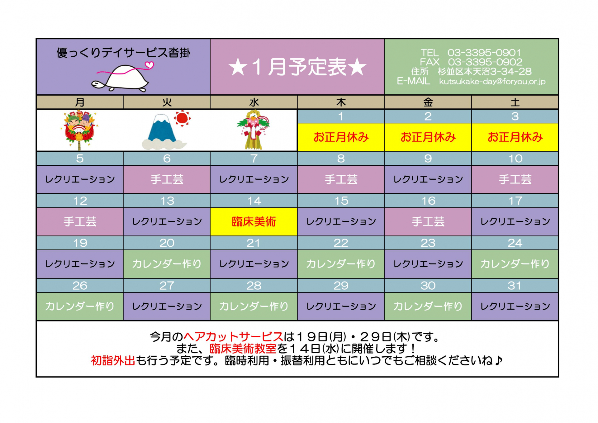 また、臨床美術教室は14日(水)に開催いたします!初詣外出も行う予定です!(^^♪