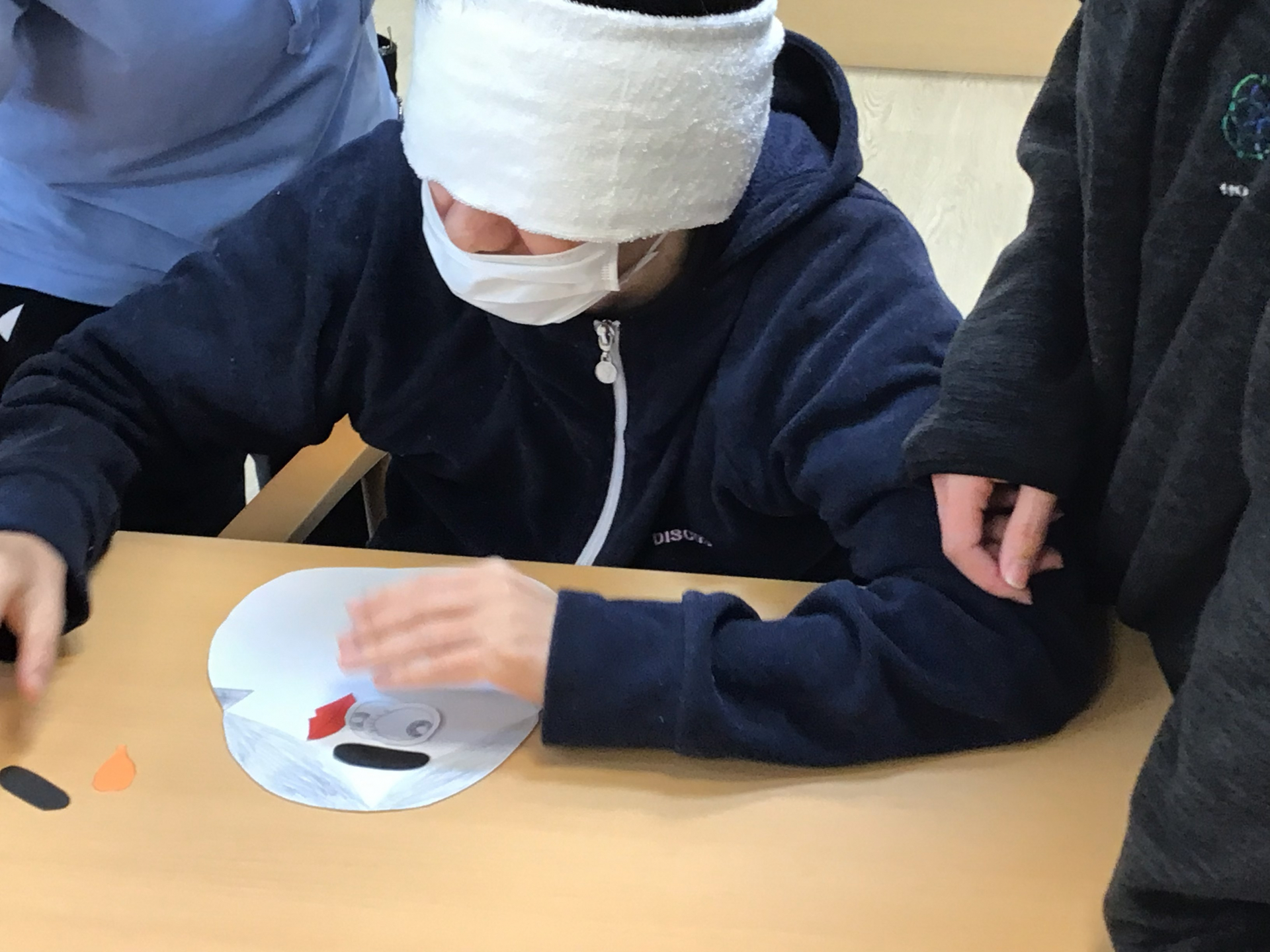 しっかりと目隠しをしたあと、今年の「福笑い」スタートで~す!