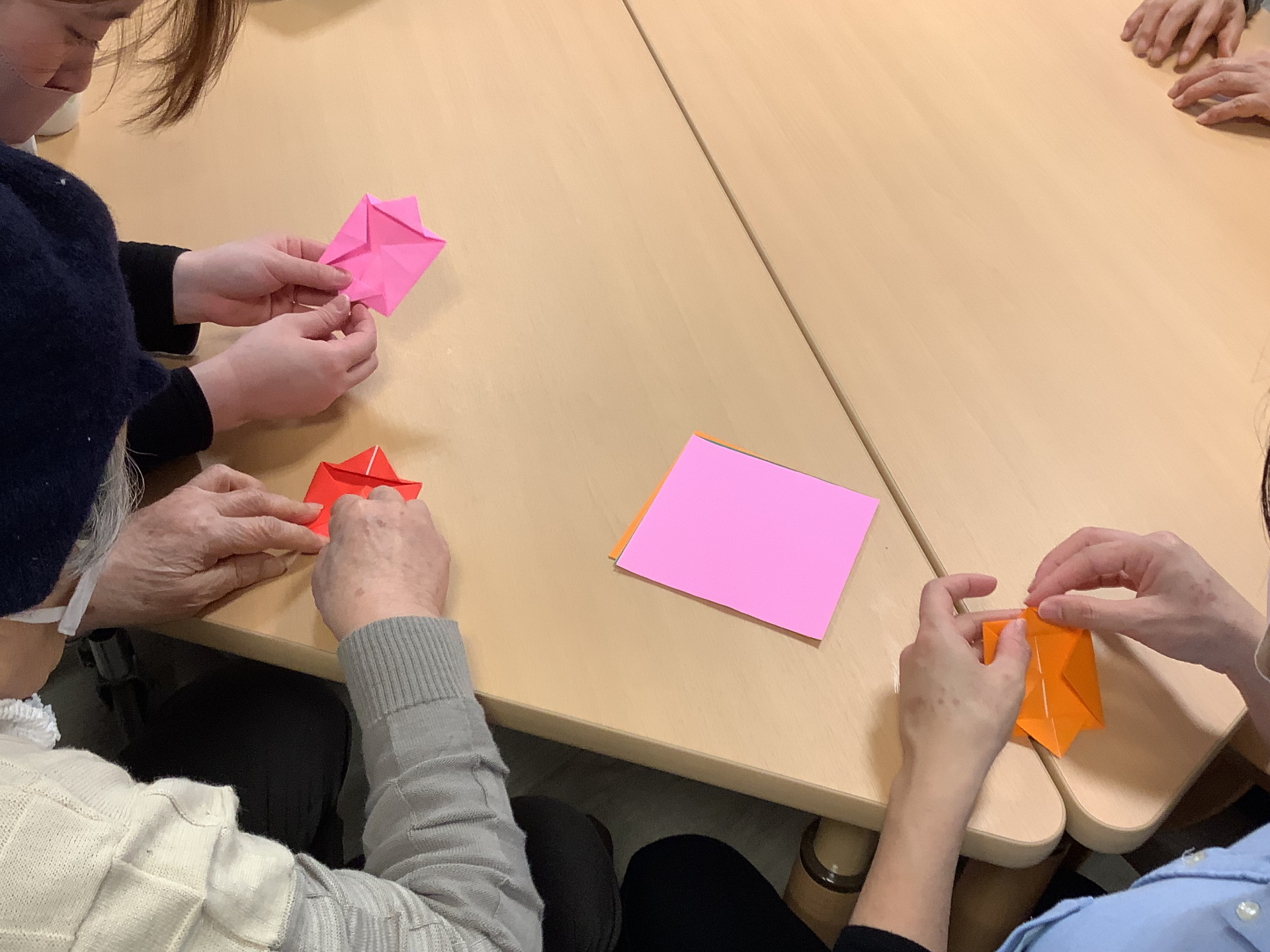 おやつ後は、皆さまでトランプを楽しまれたり、童謡を歌われたりして賑やかな雰囲気で過ごされました(^^♪こちらは、夕食を召し上がってお帰りになるお二方で、お食事が運ばれるまでの時間、折り紙で『鬼』を作っていただきました( ^∀^)