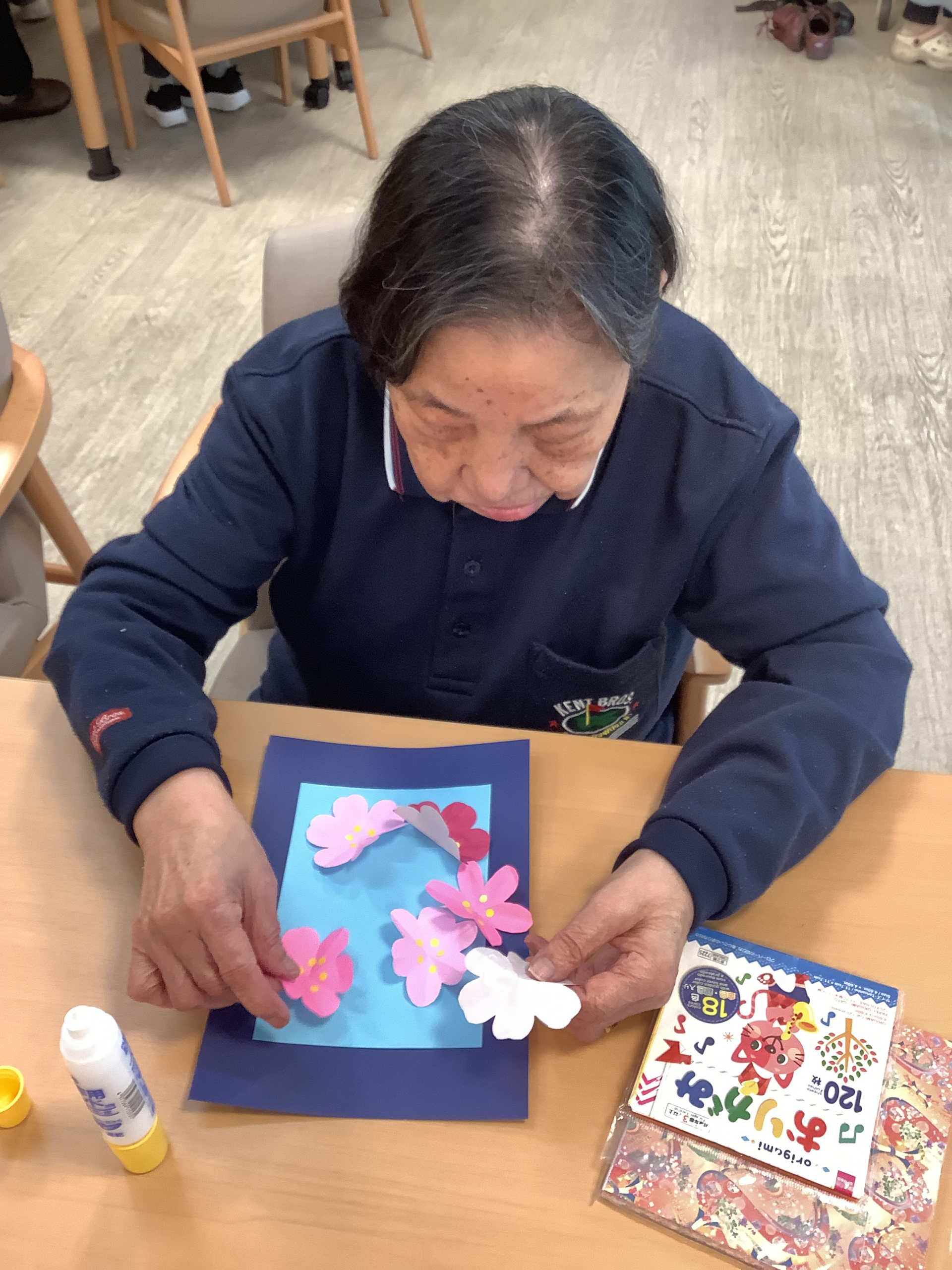本日は午後の手工芸で、折り紙を使って梅の花を作りました。
