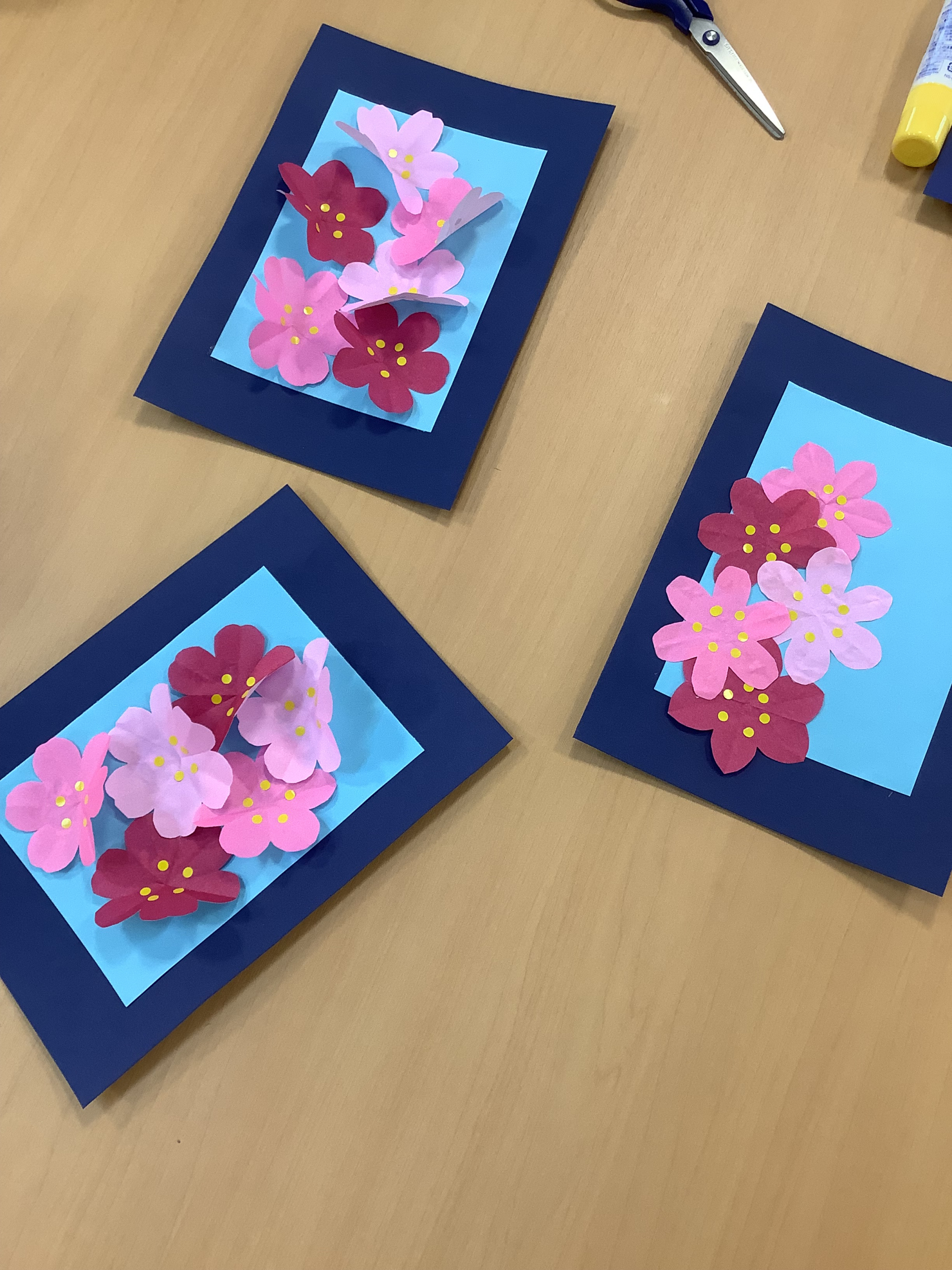 最後に台紙に梅の花を貼りつけると完成です(*^_^*)