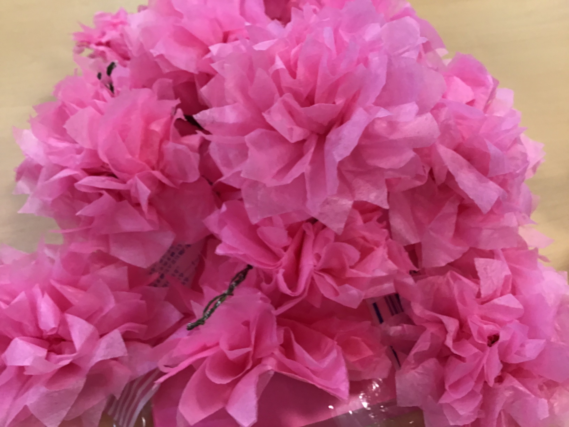 今日の午後は手工芸レクということで、ピンク色の「おはながみ」を使ってフラワー作りをしました(^_-)-☆