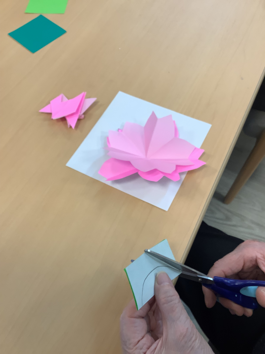 折り紙を桜や葉っぱの形に切って、綺麗な桜になるように、台紙に貼り付けます!(^^)!