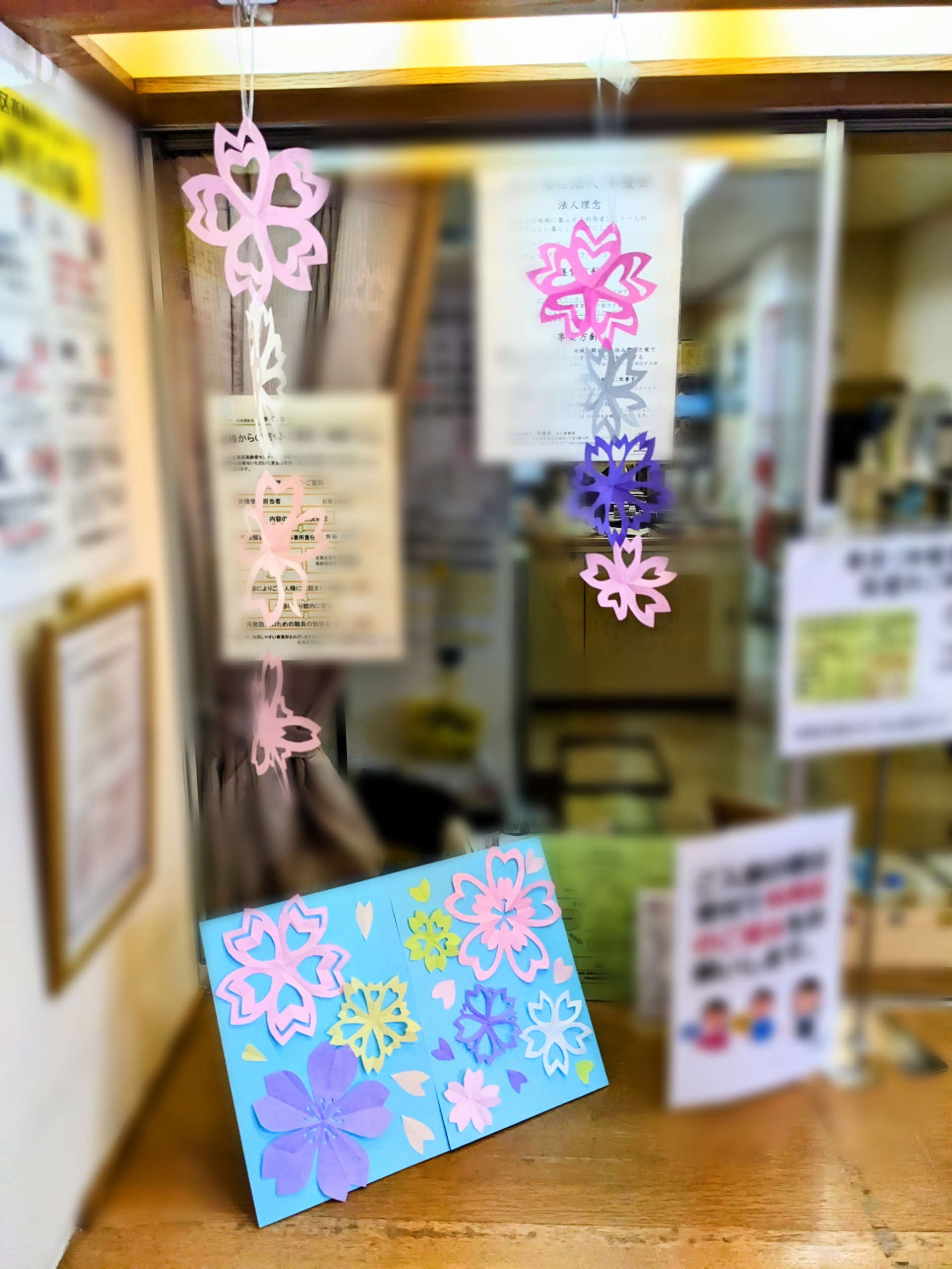 受付には先日の切り紙講座で作成した桜の作品を飾っています♪お立ち寄りの際にはぜひご覧になってくださいね!