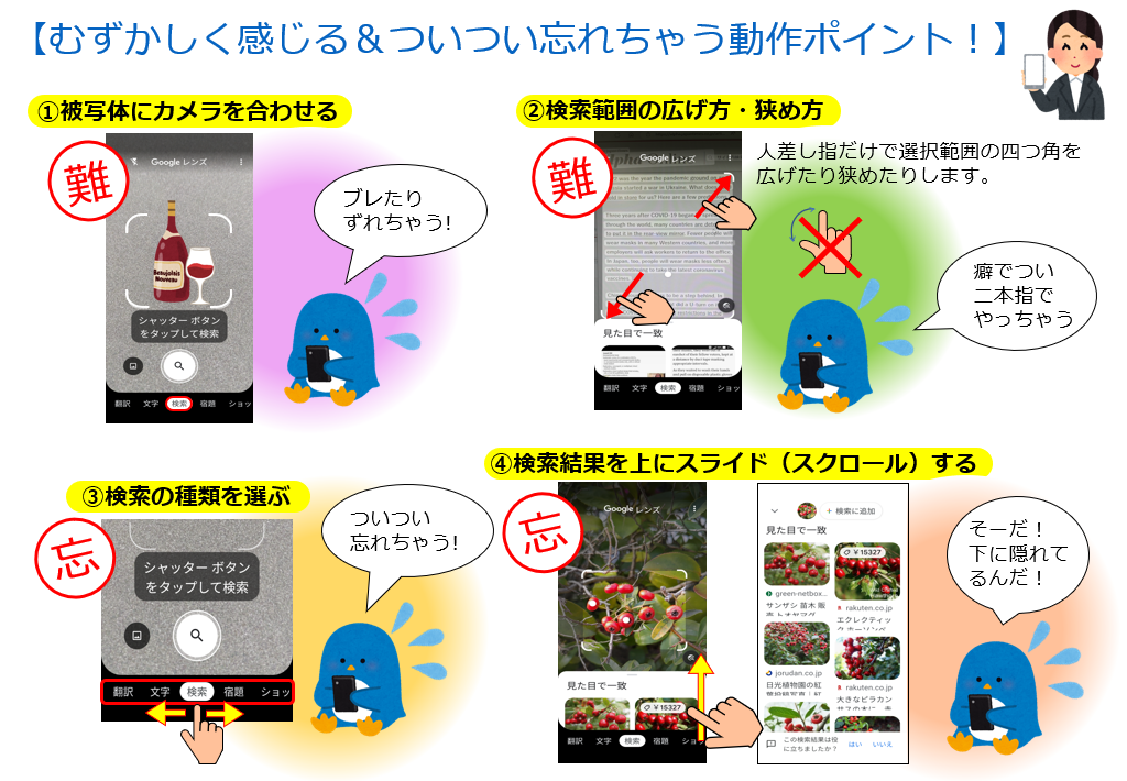 画像は「Googleレンズ」使用時に難しく感じるポイントをまとめたものです。ご参考になさってください。講座参加者には「簡単5ステップ」として使用の仕方を裏面に印刷したものをお配りしています。