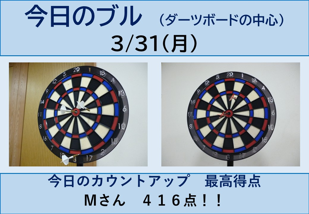 3月2回目のダーツ体験会です。本日はブル(ダーツボードの中心、25点・50点と高得点)がとても多く出ました。今日は皆さん高得点で、初めてダーツを体験された方も200点越えをマークされるなど大盛り上がりでした。ダーツはリピート参加の方もたくさんいらっしゃるのでうれしいことです。ダーツが初めての方も、コツをつかむと得点が増えていくことで楽しさが増していくようです。最初は距離感や力の入れ方に戸惑う間もしれませんが、続けることが上達の近道です。