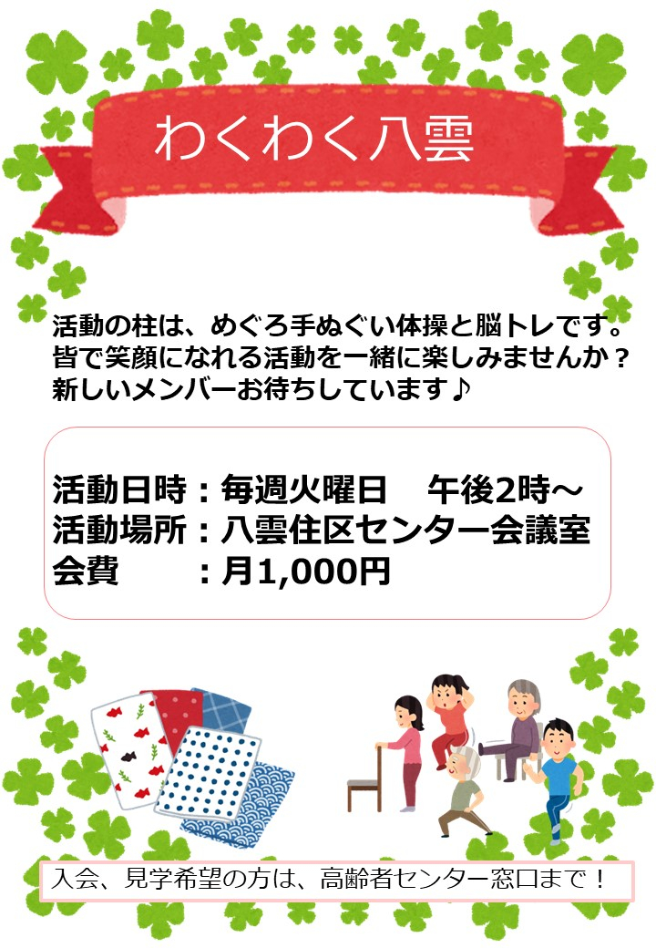 「シニアの部活めぐろ手ぬぐい体操グループづくりコース」終了後は「わくわく八雲」というサークルを作り、継続して手ぬぐい体操をしていらっしゃいます。