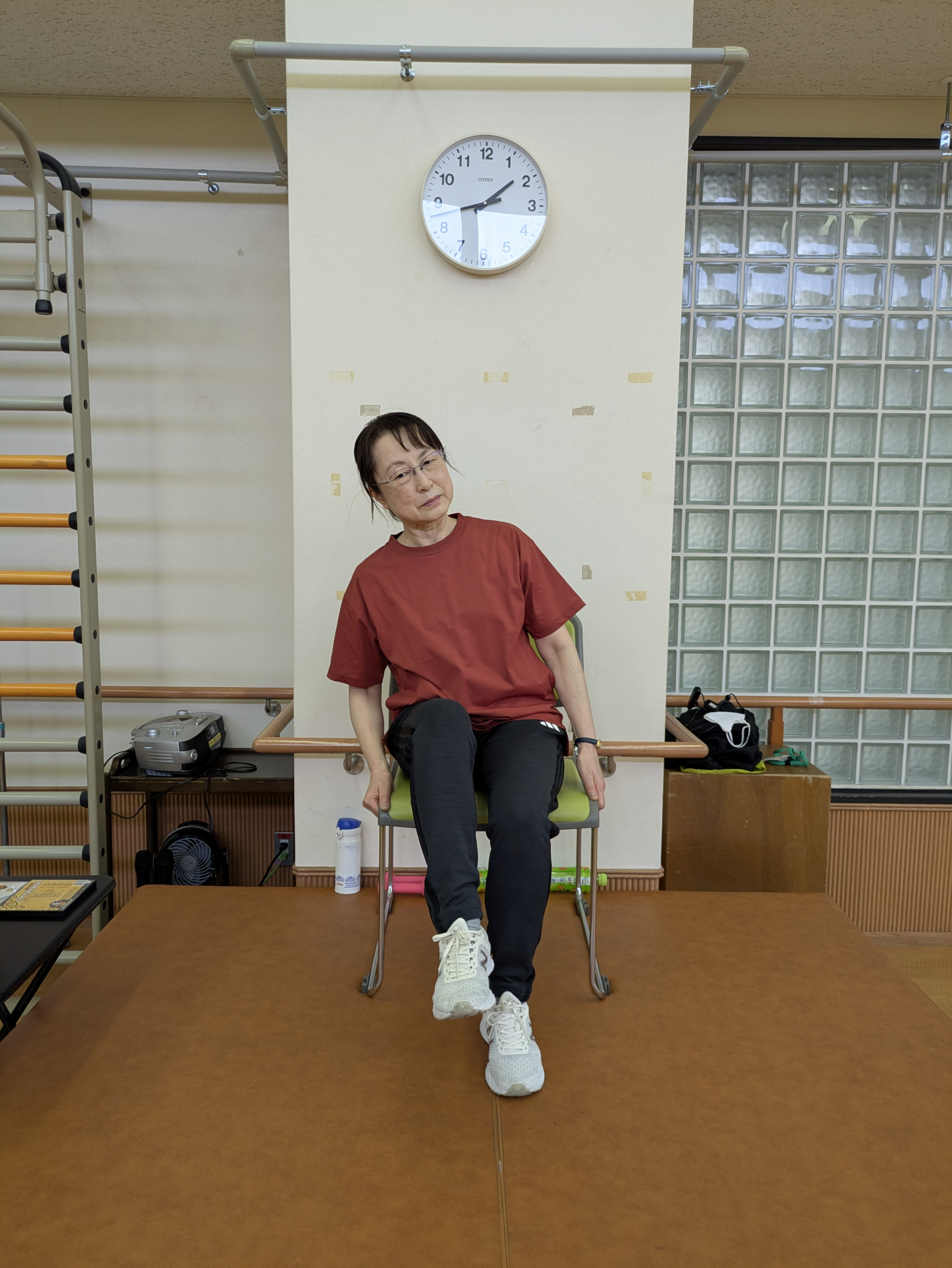 こちらは、座って少しだけ横に体を傾けています。写真① この姿勢のまま、数秒間保ちます。