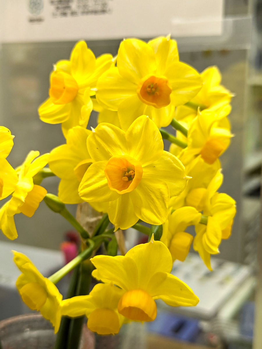 通りすぎる方や窓口にいらっしゃる方もこの可愛らしい水仙に釘付けになっています(*^▽^*)