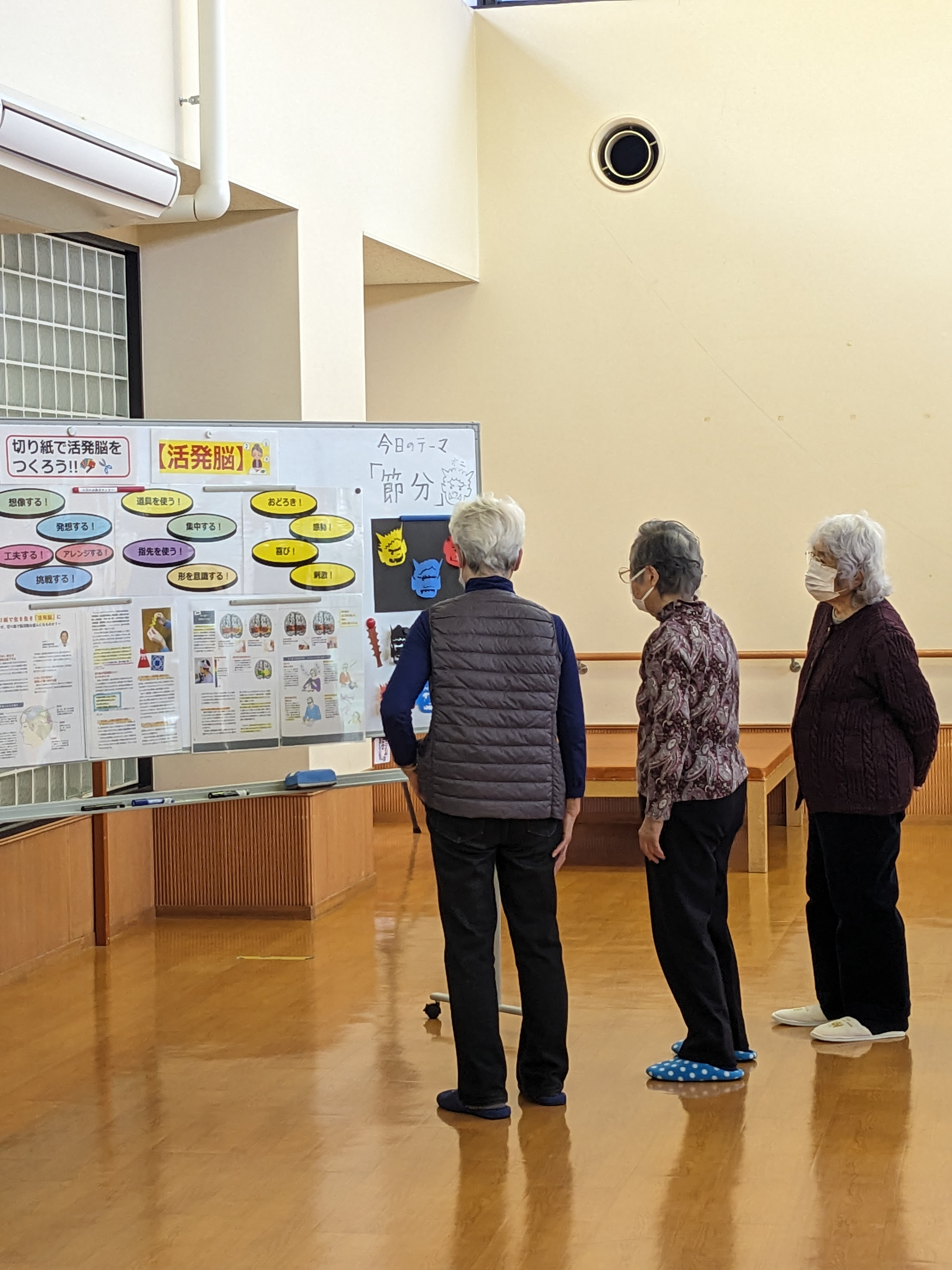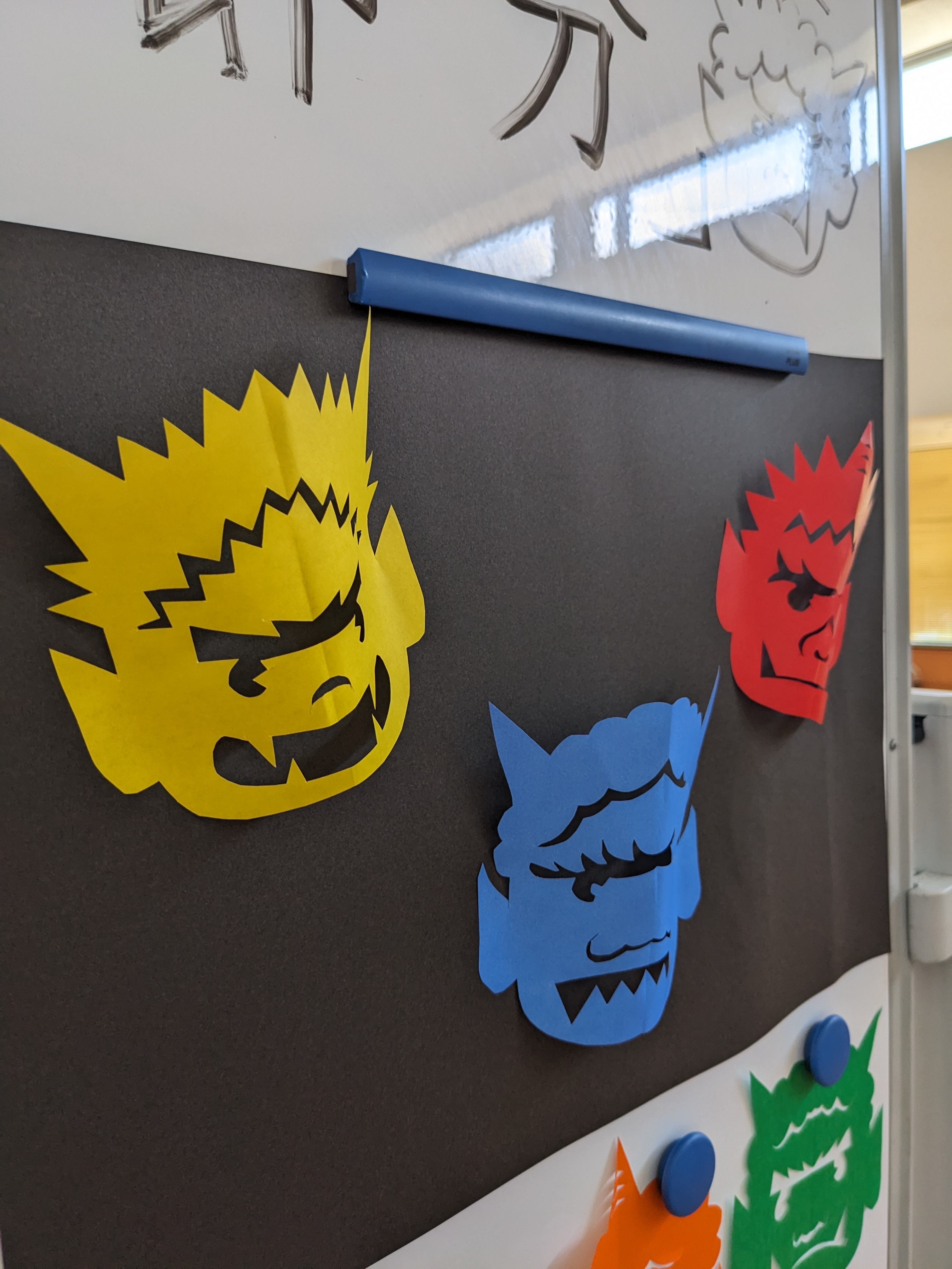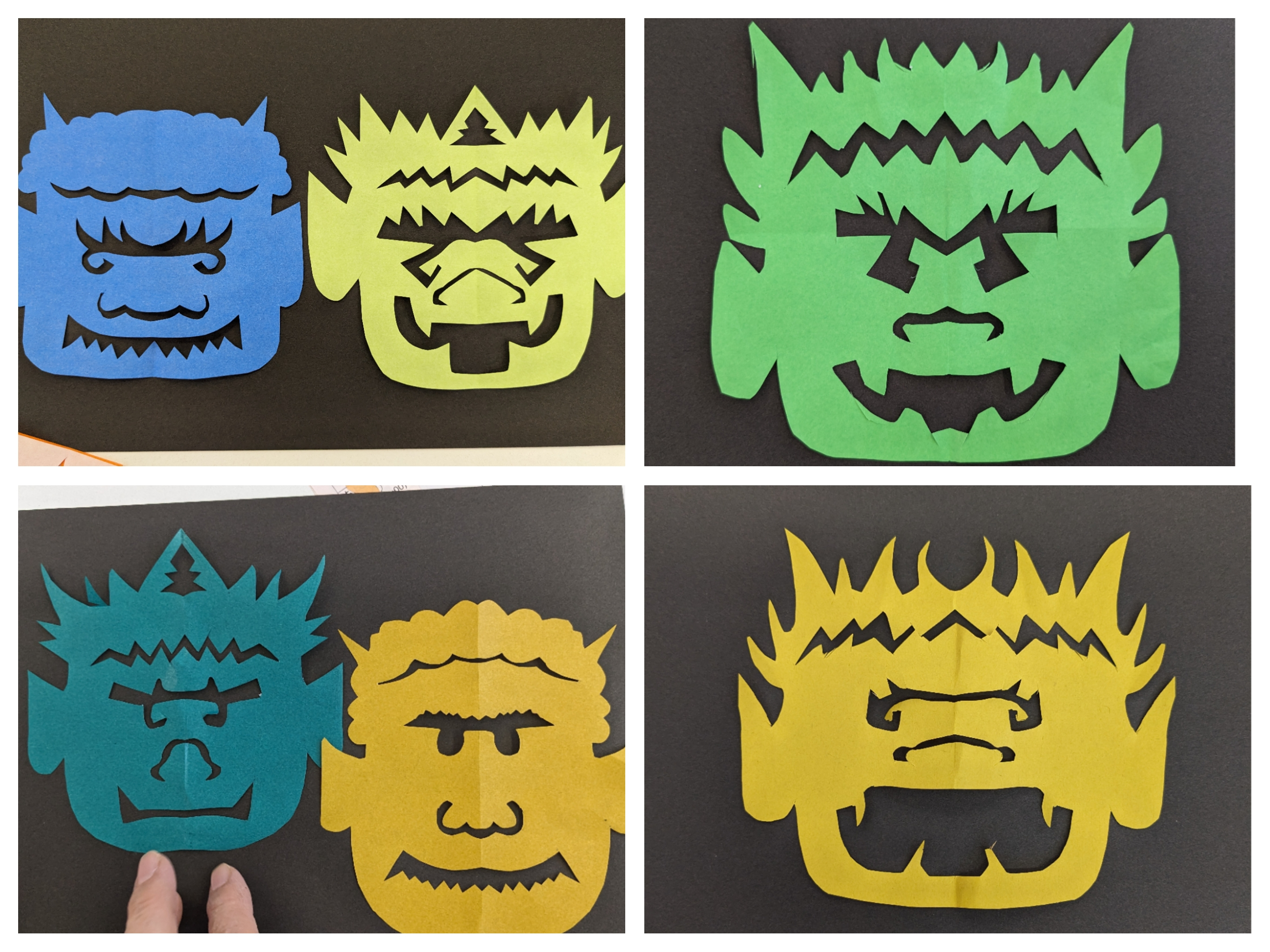 今回は黒の台紙に立体的に貼って奥行きを出した作品にしました!見本の線画を一生懸命写しながら個性あふれるオリジナルの鬼が出来上がるのが楽しいですね!