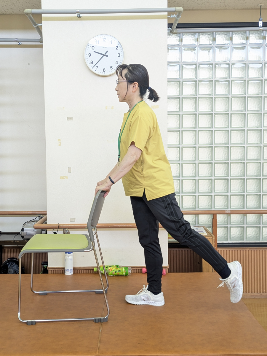 片足立ちの運動はバランスを崩すことがあるので、何かにつかまってください。