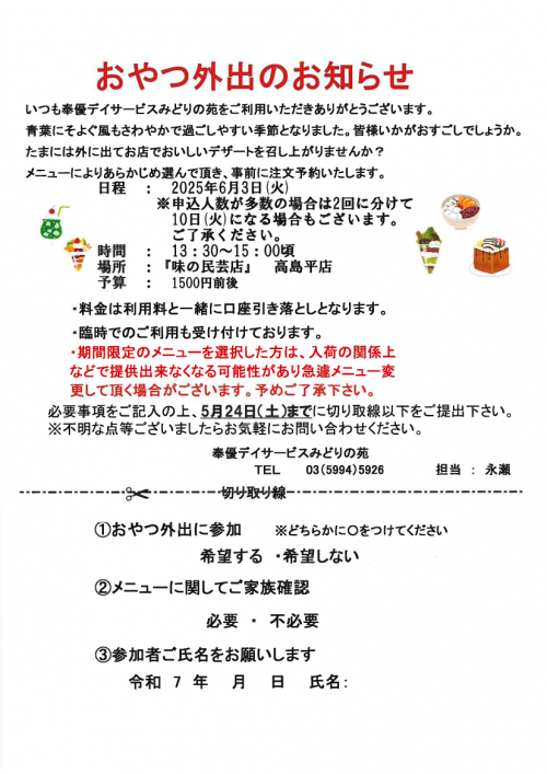 2025.12.10 【みどりデイ】ハンドベル演奏会②☆ 活動報告 #クリスマス #もうすぐクリスマス #奉優デイサービスみどりの苑 #ハンドベル # 奉優会 2025.12.10 【みどりデイ】12月ハンドベル演奏会☆ 活動報告 #ハンドベル #ハンドベル演奏会 #クリスマス #奉優デイサービスみどりの苑 # 奉優会 2025.12.09 【みどりデイ】みどり喫茶の日②☆ 活動報告 #喫茶の日 #奉優デイサービスみどりの苑 # 奉優会 # みどりデイ 2025.12.09 【みどりデイ】みどり喫茶の日①☆ 活動報告 #喫茶の日 # 奉優デイサービスみどりの苑 # 奉優会 2025.12.08 【みどりデイ】12月水彩絵手紙②☆ 活動報告 #水彩絵手紙 #クリスマス #もうすぐクリスマス #奉優会 #奉優デイサービスみどりの苑 2025.12.08 【みどりデイ】12月水彩絵手紙①☆ 事務局 #水彩絵手紙 #クリスマス #もうすぐクリスマス #奉優会 # 奉優デイサービスみどりの苑 2025.12.06 【みどりデイ】手工芸クリスマスリース作り②☆ 活動報告 #クリスマスリース #手工芸 #奉優会 # 奉優デイサービスみどりの苑 2025.12.06 【みどりデイ】手工芸クリスマスリース作り①☆ 活動報告 #クリスマスリース作り #奉優デイサービスみどりの苑 #手工芸 # 奉優会 2025.12.06 【みどりデイ】クリスマスツリーを飾りました☆ 活動報告 #クリスマスツリー #奉優デイサービスみどりの苑 # 奉優会 2025.12.05 【みどりデイ】♦みどり通信11月号のお知らせ お知らせ #奉優デイサービスみどりの苑 #奉優会 #みどり通信 #11月 2025.12.05 【みどりデイ】中西先生の立ちましょビクス②☆ 活動報告 #立ましょビクス #中西先生 #奉優デイサービスみどりの苑 # 奉優会 2025.12.04 【みどりデイ】♦年末年始のお知らせ お知らせ # 奉優デイサービスみどりの苑 # 奉優会 #お知らせ #年末年始のお知らせ 2025.12.04 【みどりデイ】日常♪書道と貼り絵☆ 活動報告 #日常 #書道 #貼り絵 #奉優デイサービスみどりの苑 # 奉優会 2025.12.04 【みどりデイ】中西先生の立ちましょビクス☆ 活動報告 #淑徳大学 #中西先生 #立ちましょビクス #奉優会 # 奉優デイサービスみどりの苑 2025.12.03 【みどりデイ】クリスマス装飾しました~☆ 活動報告 #クリスマス飾り #奉優会 #奉優デイサービスみどりの苑 1 2 3 … 46