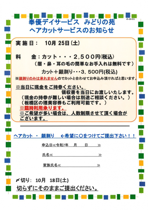 2025.10.08 【みどりデイ】水彩絵手紙③♪ 活動報告 #奉優会 #奉優デイサービスみどりの苑 #水彩絵手紙 #10月 2025.10.08 【みどりデイ】水彩絵手紙②♪ 活動報告 #奉優会 #奉優デイサービスみどりの苑 #水彩絵手紙 #10月 2025.10.08 【みどりデイ】水彩絵手紙♪ 活動報告 #奉優会 #奉優デイサービスみどりの苑 #水彩絵手紙 #10月 2025.10.08 【みどりデイ】手工芸②♪ 活動報告 #奉優会 #奉優デイサービスみどりの苑 #パウダーマグネット 2025.10.08 【みどりデイ】手工芸♪ 活動報告 #奉優会 #奉優デイサービスみどりの苑 #パウダーマグネット 2025.10.03 【みどりデイ】立ちましょうビクス体操♪ 活動報告 #奉優会 #奉優デイサービスみどりの苑 #立ちましょうビクス体操 2025.10.02 【みどりデイ】みどり通信9月号♪ 活動報告 #奉優会 #奉優デイサービスみどりの苑 #みどり通信 #9月号 2025.10.01 【みどりデイ】スイーツフェアのお知らせ♪ お知らせ #奉優会 #奉優デイサービスみどりの苑 #スイーツフェア #シュークリーム 2025.09.30 【みどりデイ】敬老会③♪ 活動報告 #奉優会 #奉優デイサービスみどりの苑 #敬老会 2025.09.30 【みどりデイ】土田職員お世話になりました♪ 活動報告 #奉優会 #奉優デイサービスみどりの苑 #異動 #ありがとうございました 2025.09.30 【みどりデイ】全体制作~実りの秋~③♪ 活動報告 #奉優会 #奉優デイサービスみどりの苑 #ぶどう 2025.09.30 【みどりデイ】10月ヘアカットのお知らせ♪ お知らせ #奉優会 #奉優デイサービスみどりの苑 #ヘアカットのお知らせ 2025.09.27 【みどりデイ】フラワーアレンジメント③♪ 活動報告 #奉優会 #奉優デイサービスみどりの苑 #フラワーアレンジメント #秋 2025.09.27 【みどりデイ】フラワーアレンジメント②♪ 活動報告 #奉優会 #奉優デイサービスみどりの苑 #フラワーアレンジメント #9月 2025.09.27 【みどりデイ】フラワーアレンジメント♪ 活動報告 #奉優会 #奉優デイサービスみどりの苑 #フラワーアレンジメント #秋 1 2 3 … 42
