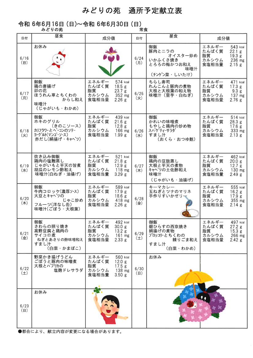 2024.06.11 お知らせ 【みどりデイ】6月献立表後半 Tweet シェアする 皆さまこんにちは! 奉優デイサービスみどりの苑です! 献立表6月後半が出来上がりましたのでお知らせします♪ 後半もイロトリドリなメニューとなっておりますので お楽しみに♪ みどりデイ 三浦 #奉優デイサービスみどりの苑 #奉優会 #献立表 #6月 前の記事 2024.06.11 お知らせ 【みどりデイ】スポンジタワーゲーム① 次の記事 2024.06.10 お知らせ 【みどりデイ】おやつ外出③ 一覧へ戻る