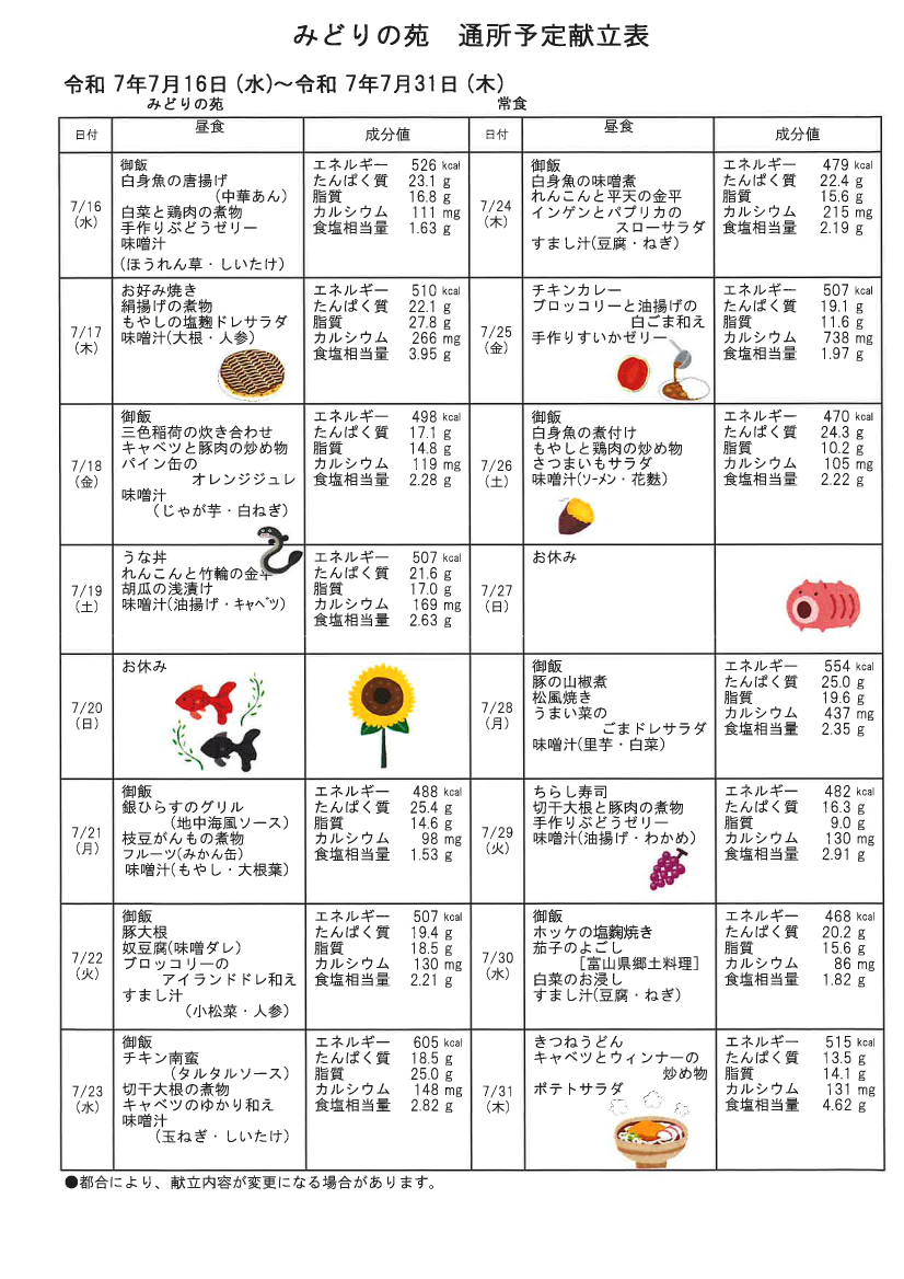 2025.07.08 活動報告 【みどりデイ】7月後半献立表♪ Tweet シェアする 皆さまこんにちは! 奉優デイサービスみどりの苑です! 7月後半の献立表ができあがりました♪ 明日から皆さまに配布予定です! うな丼楽しみですね(^^) みどりデイA.N #奉優会 #奉優デイサービスみどりの苑 #7月後半献立表 前の記事 2025.07.16 活動報告 【みどりデイ】和太鼓演奏会♪ 次の記事 2025.07.07 活動報告 【みどりデイ】七夕②♪ 一覧へ戻る