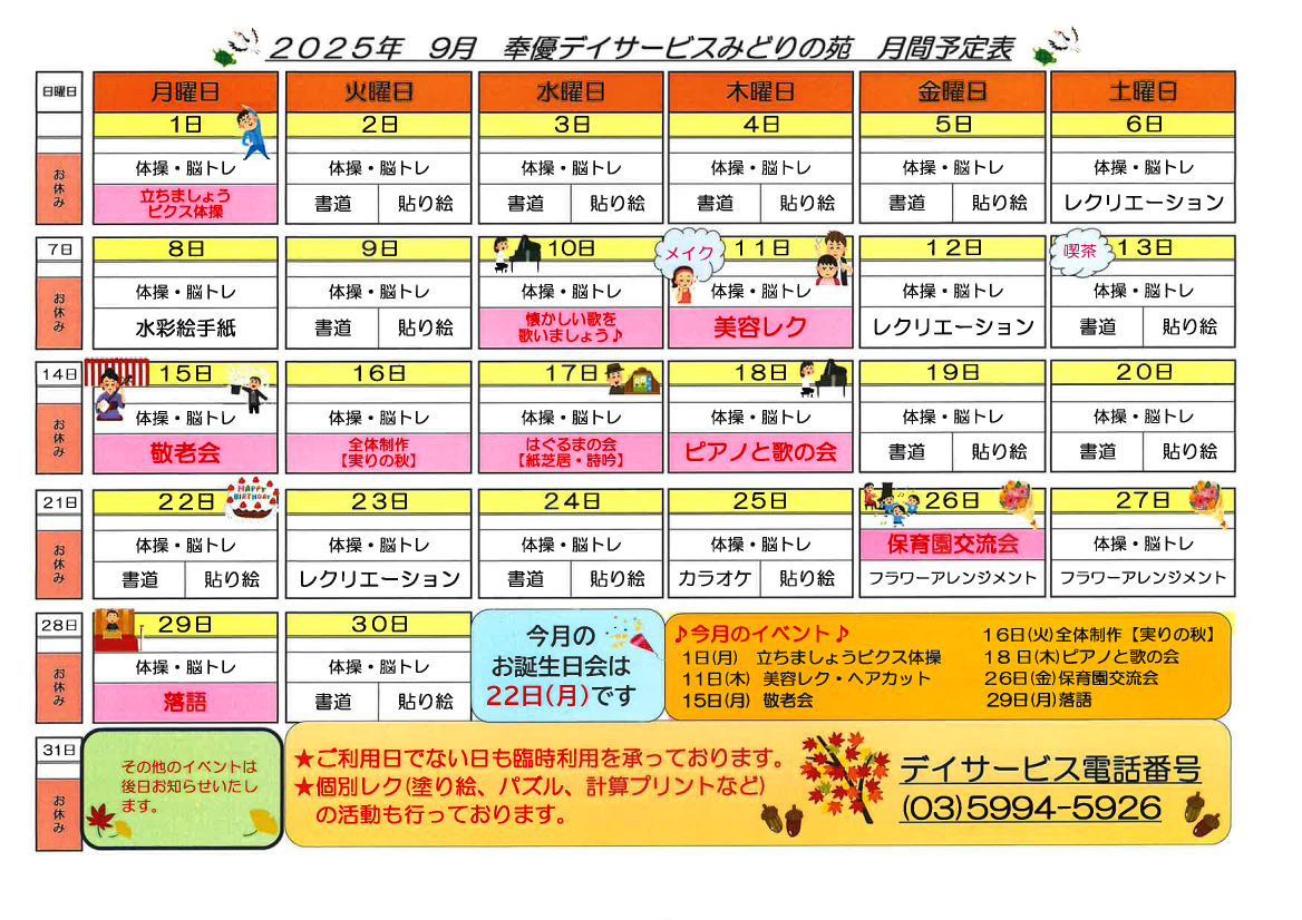 【みどりデイ】9月月間予定表♪