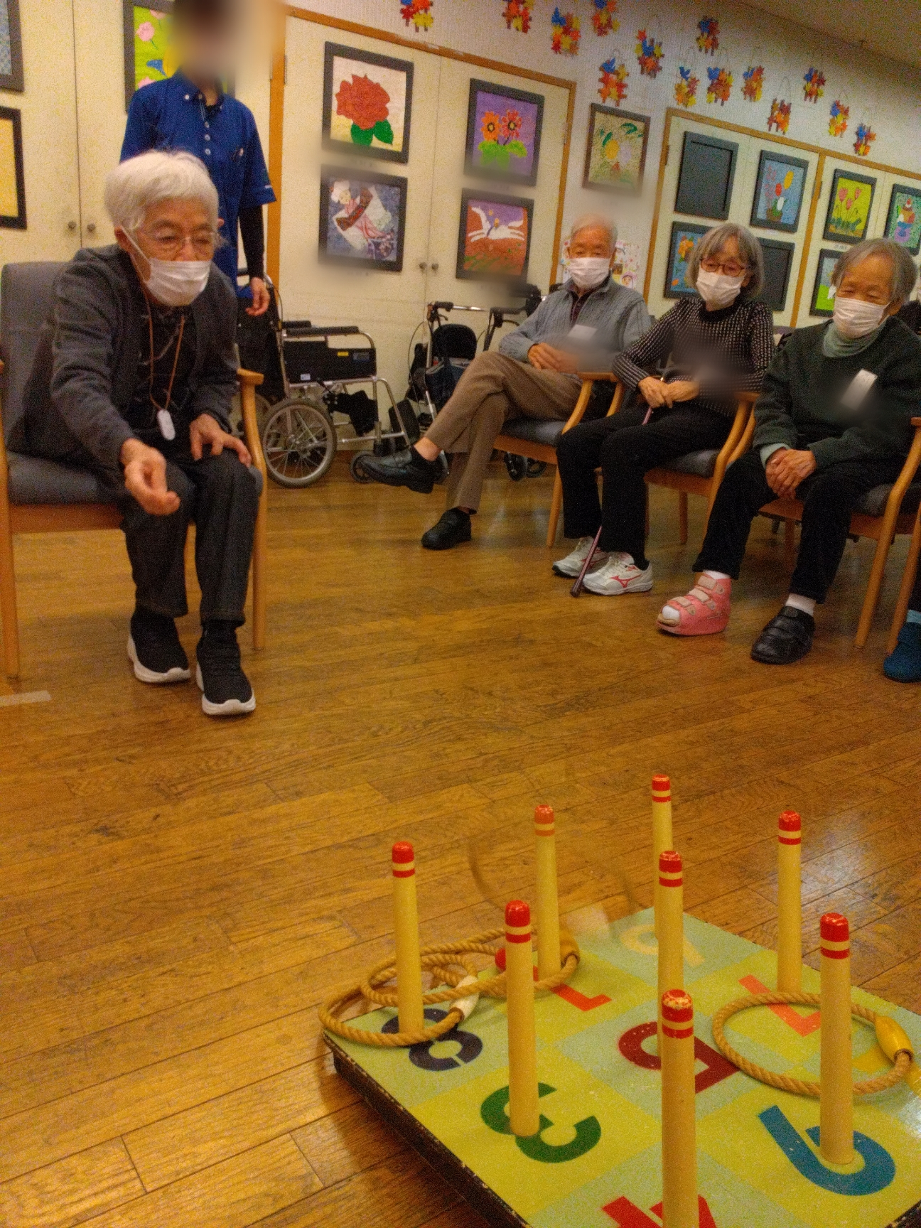 勢いつけて「そーれ!!」 連続で輪投げが入ったときは歓声が