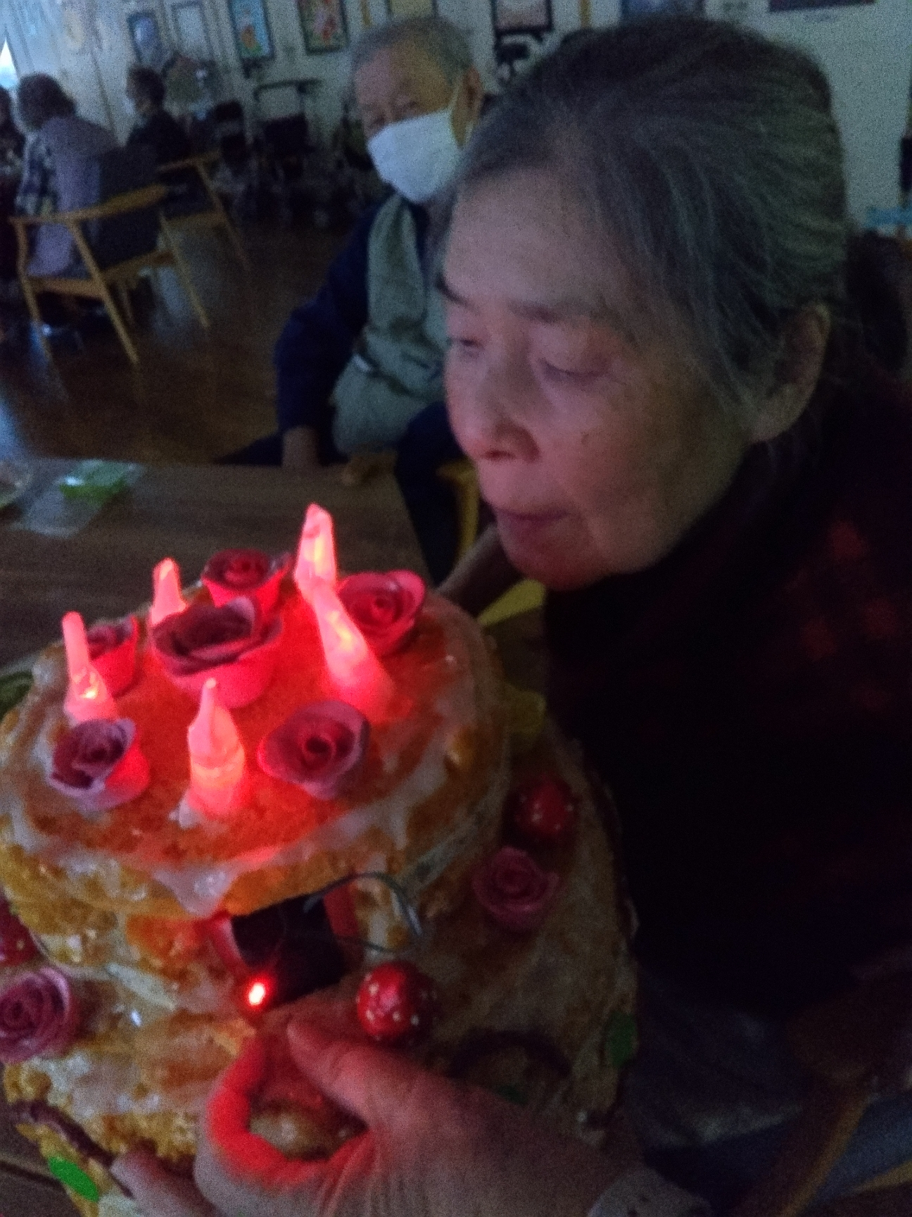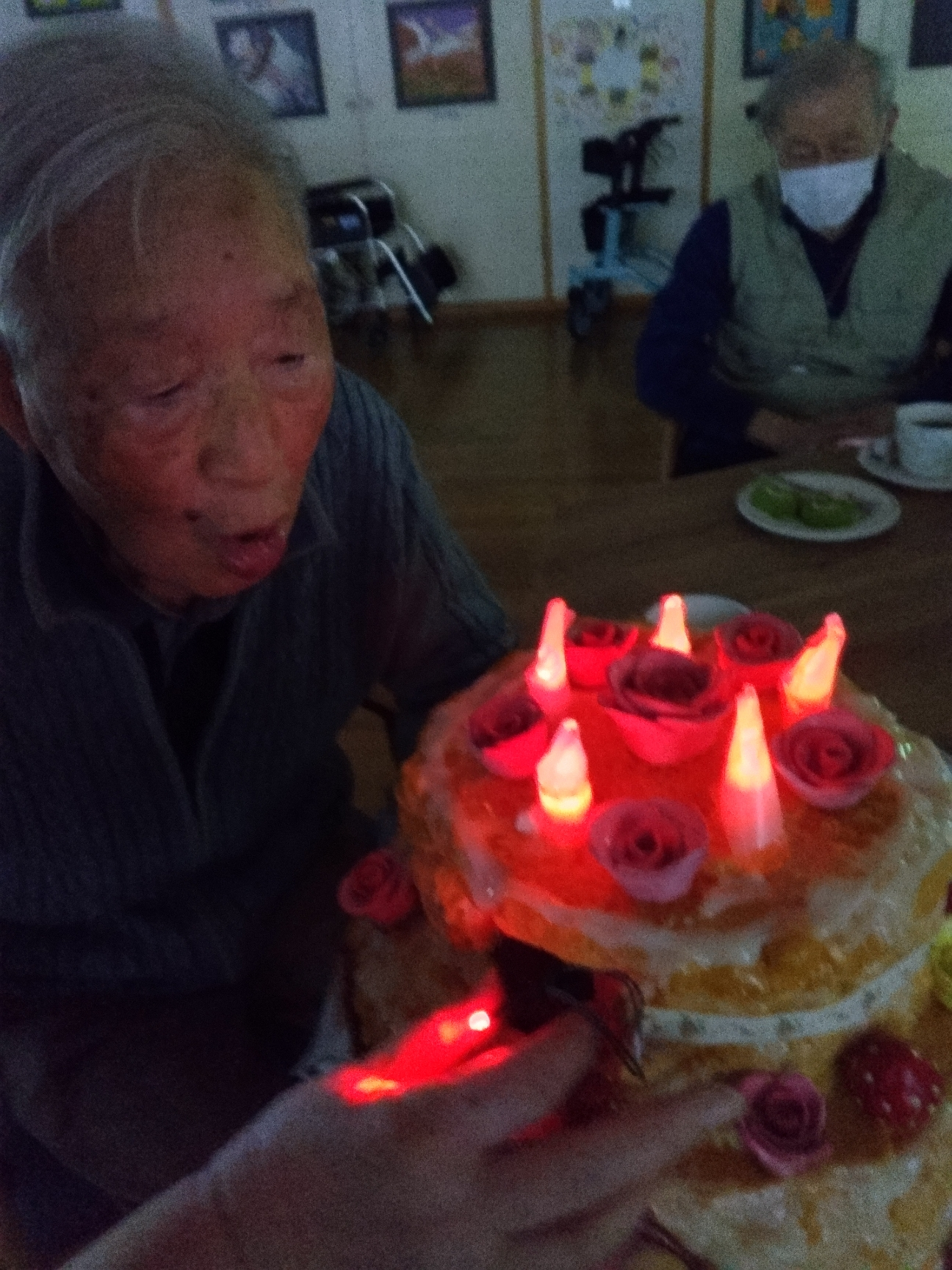 お誕生日月の方たちにはみどりの長寿誕生日ケーキのろうそくを