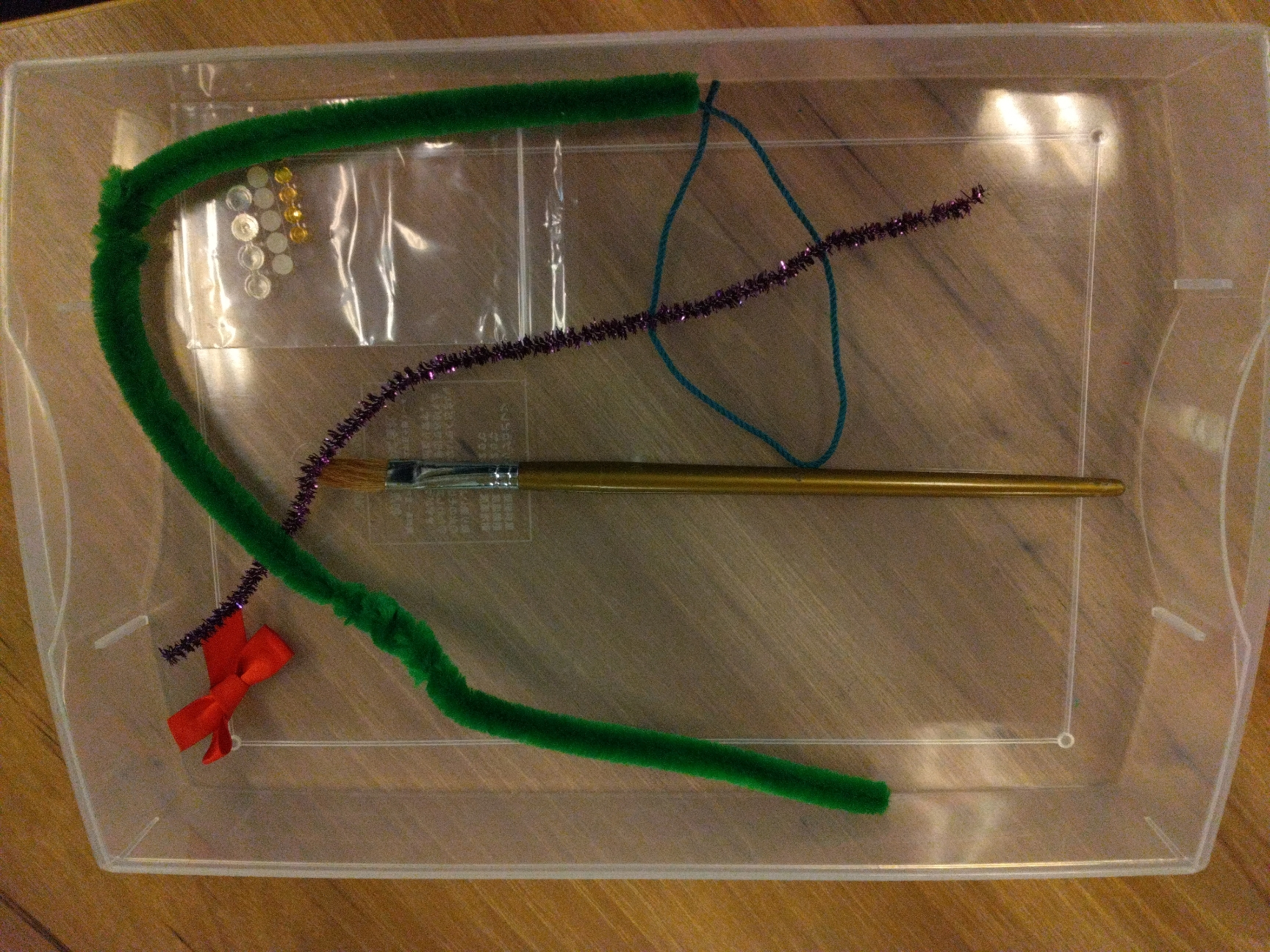 材料は緑フワフワモール三本、リボン、金具、キラキラ飾り!