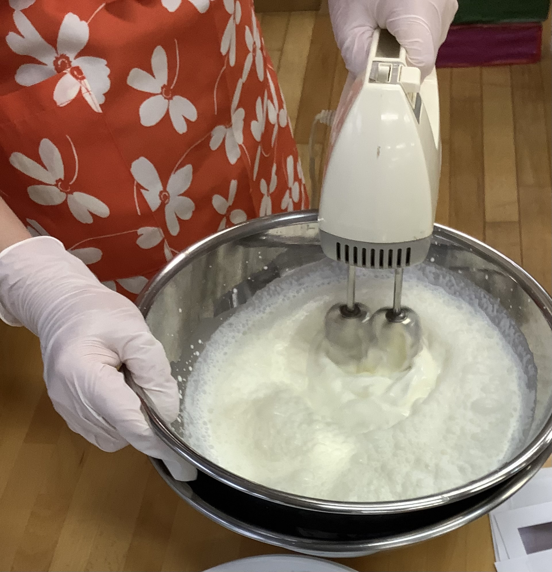 生クリーム作りからはじめました。おいしいクリームになるように時間をかけて混ぜて、、、