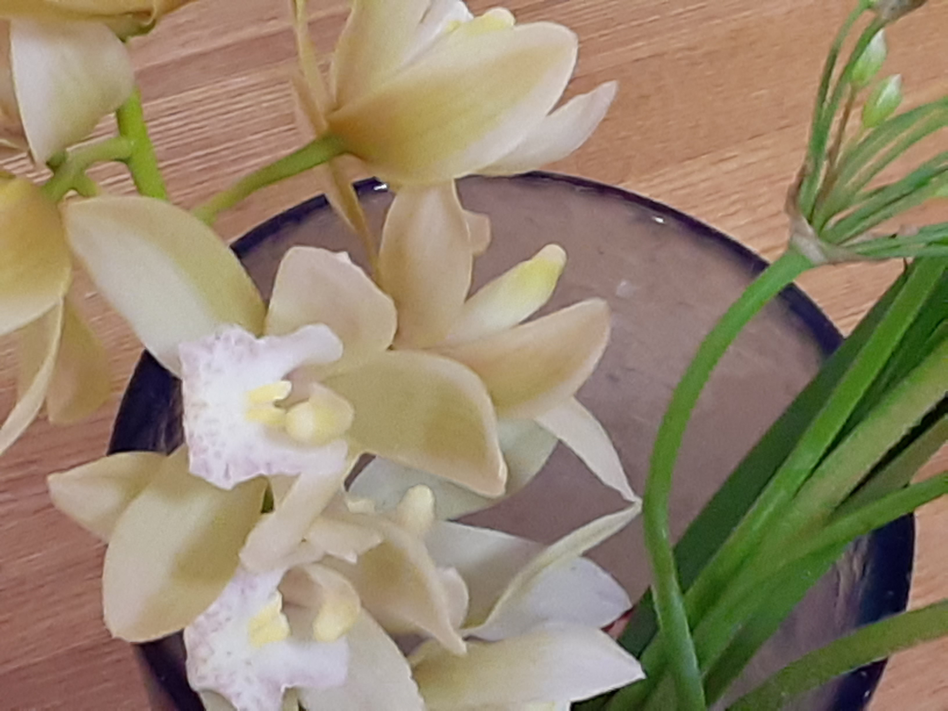 こちらはU様がご持参された「シンビジューム」です。「庭で育てていると色の変化も楽しめるのよ」と仰っていました。なるほど~!