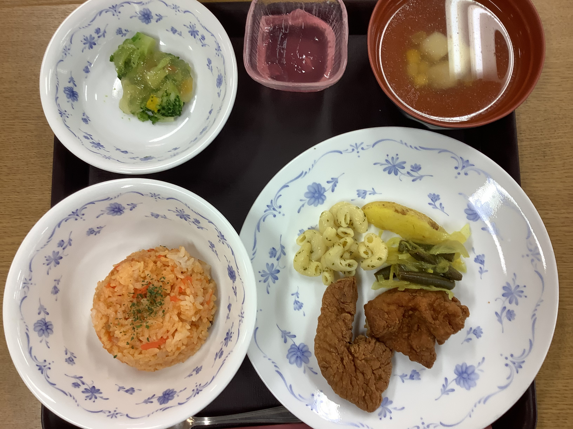 2024.12.25 活動報告 本日の昼食メニュー☆ Tweet シェアする 本日の昼食メニューは以下の通りです。 チキンライス スープ フライドチキン じゃが芋といんげんのスパイスソテー きらきらサラダ ロゼワイン風ジュレ エネルギー 581kcal 食塩 3.9g 前の記事 2024.12.26 活動報告 新年の準備(^^)〜玄関飾り〜宮前デイ 次の記事 2024.12.24 活動報告 クリスマス会🎵【宮前デイ】 一覧へ戻る