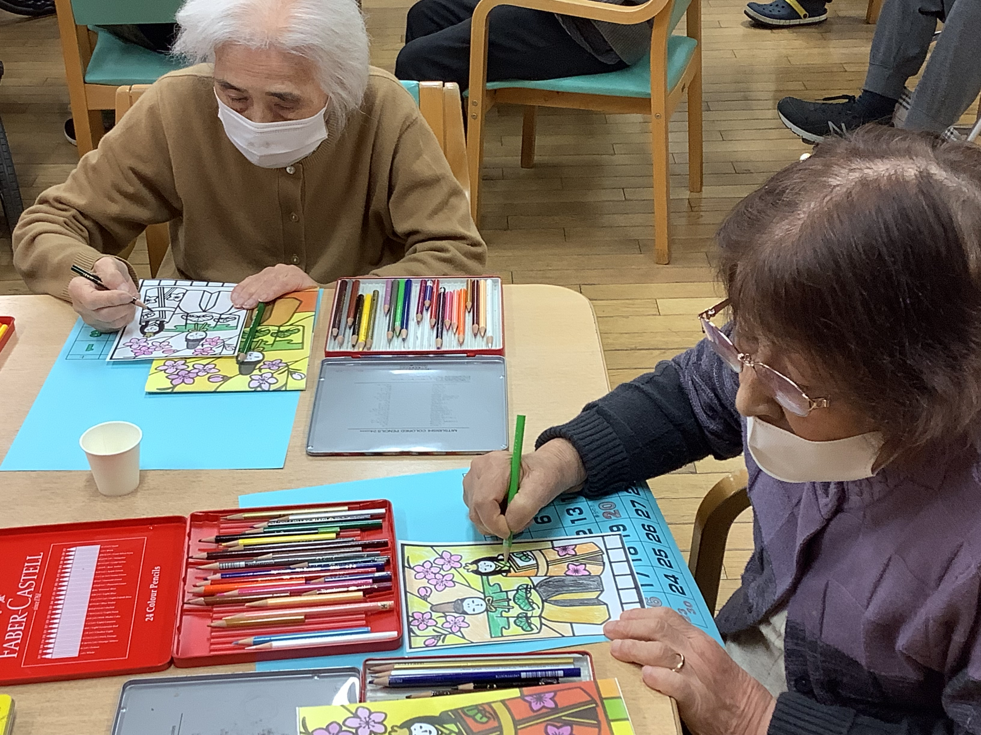 2025.02.04 活動報告 カレンダー作り♪【宮前デイ】 Tweet シェアする 個別プログラム「カレンダー作成」では、早くも3月のカレンダー作りを行なっています!!可愛らしい「ひな祭り」や「チューリップ」の塗り絵に取り組まれています(^_-)-☆ 宮前デイ y.m 前の記事 2025.02.04 活動報告 個別プログラムの様子~ボランティア体操~【宮前デイ】 次の記事 2025.02.03 活動報告 全体会議 一覧へ戻る