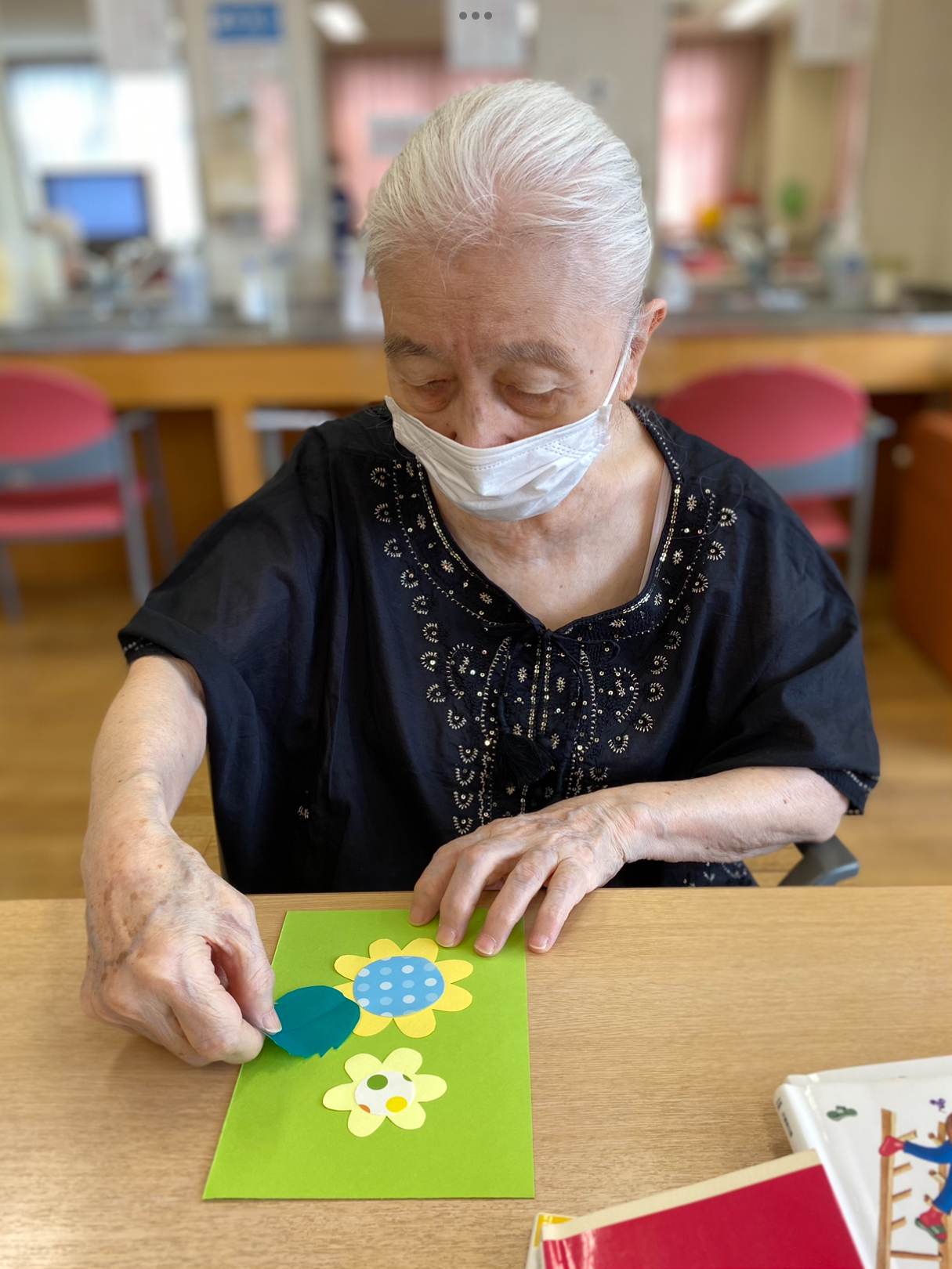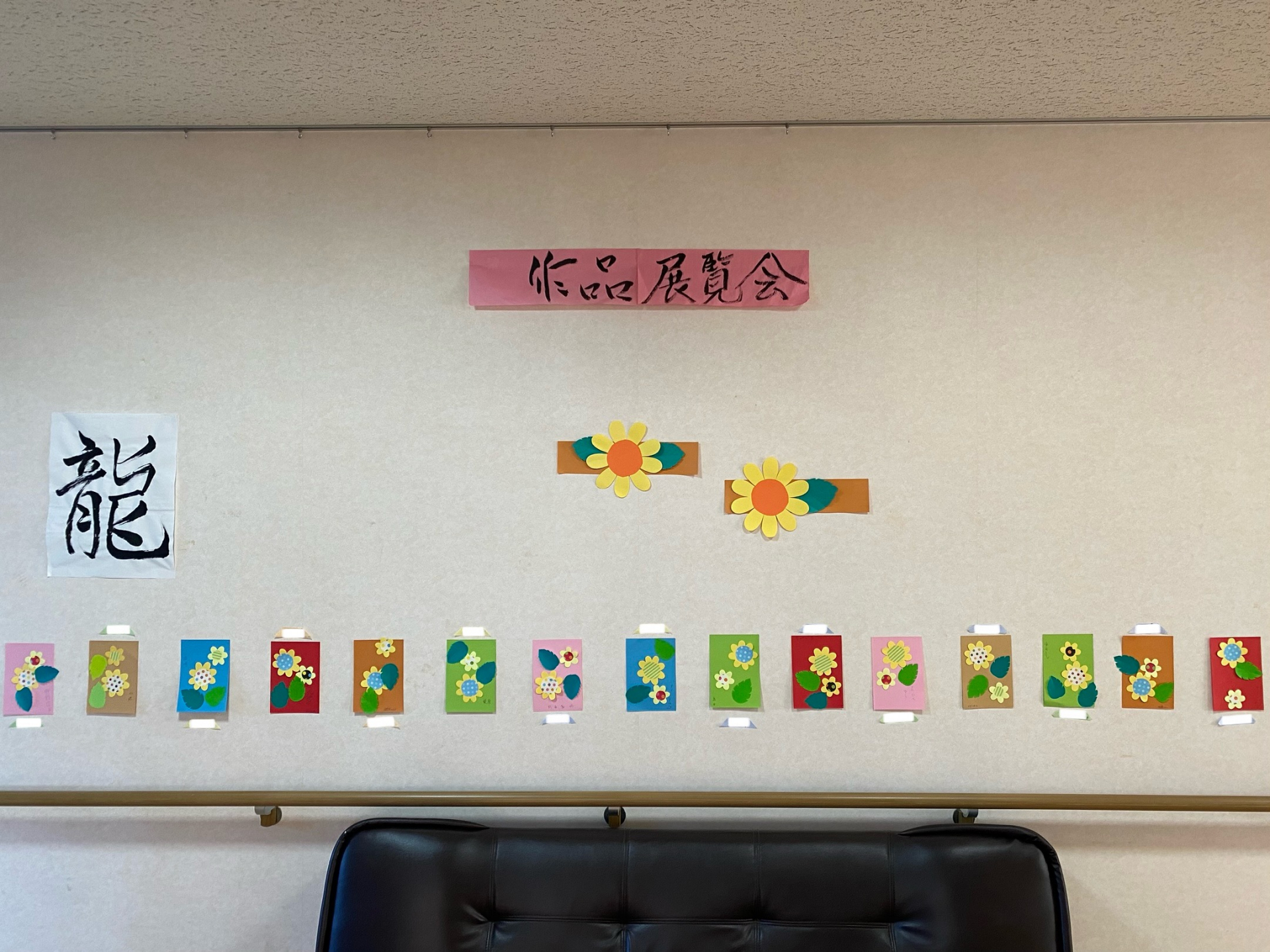 昨日も、色画用紙を使って「ひまわり」の壁飾りを作りました。