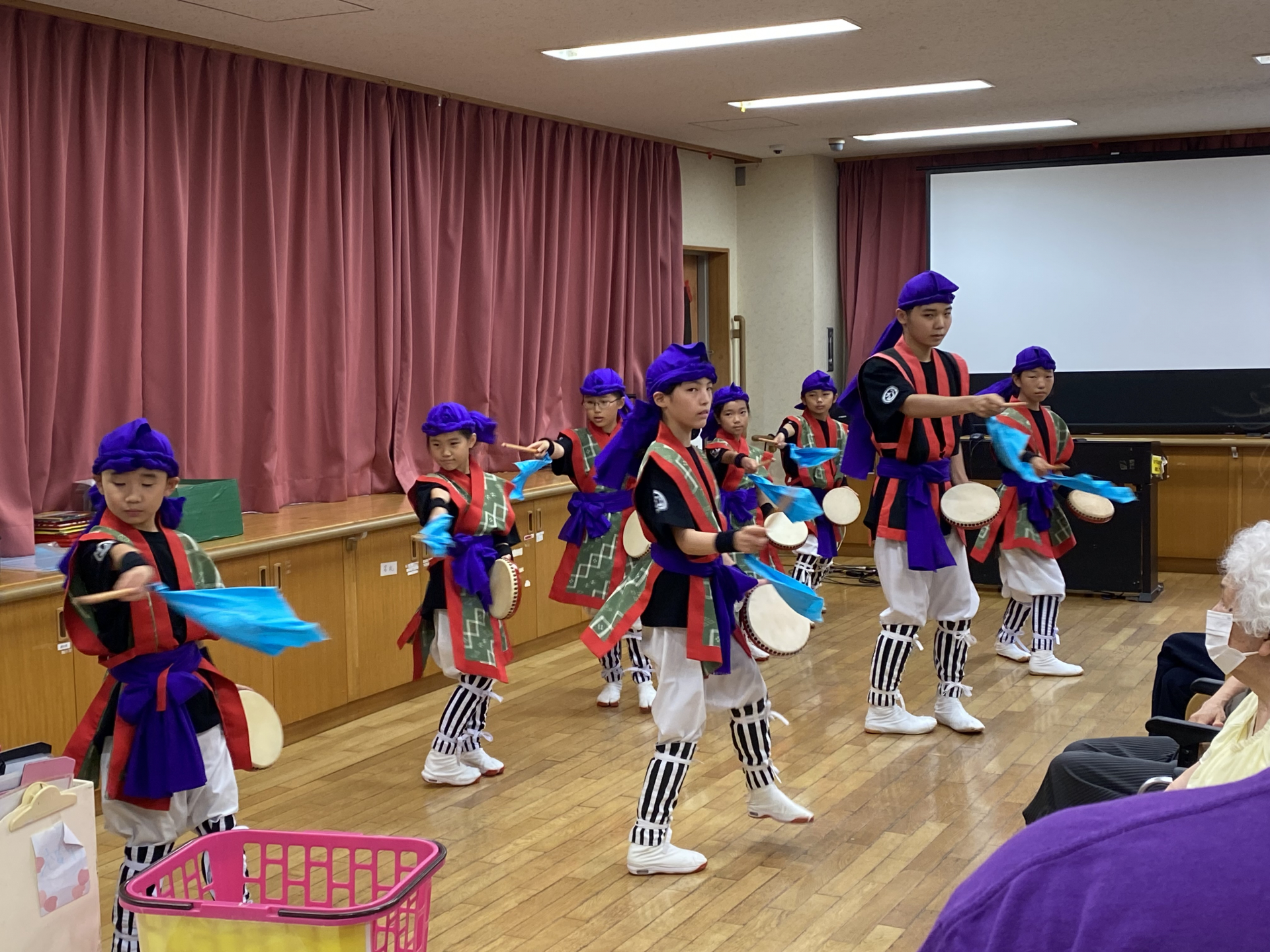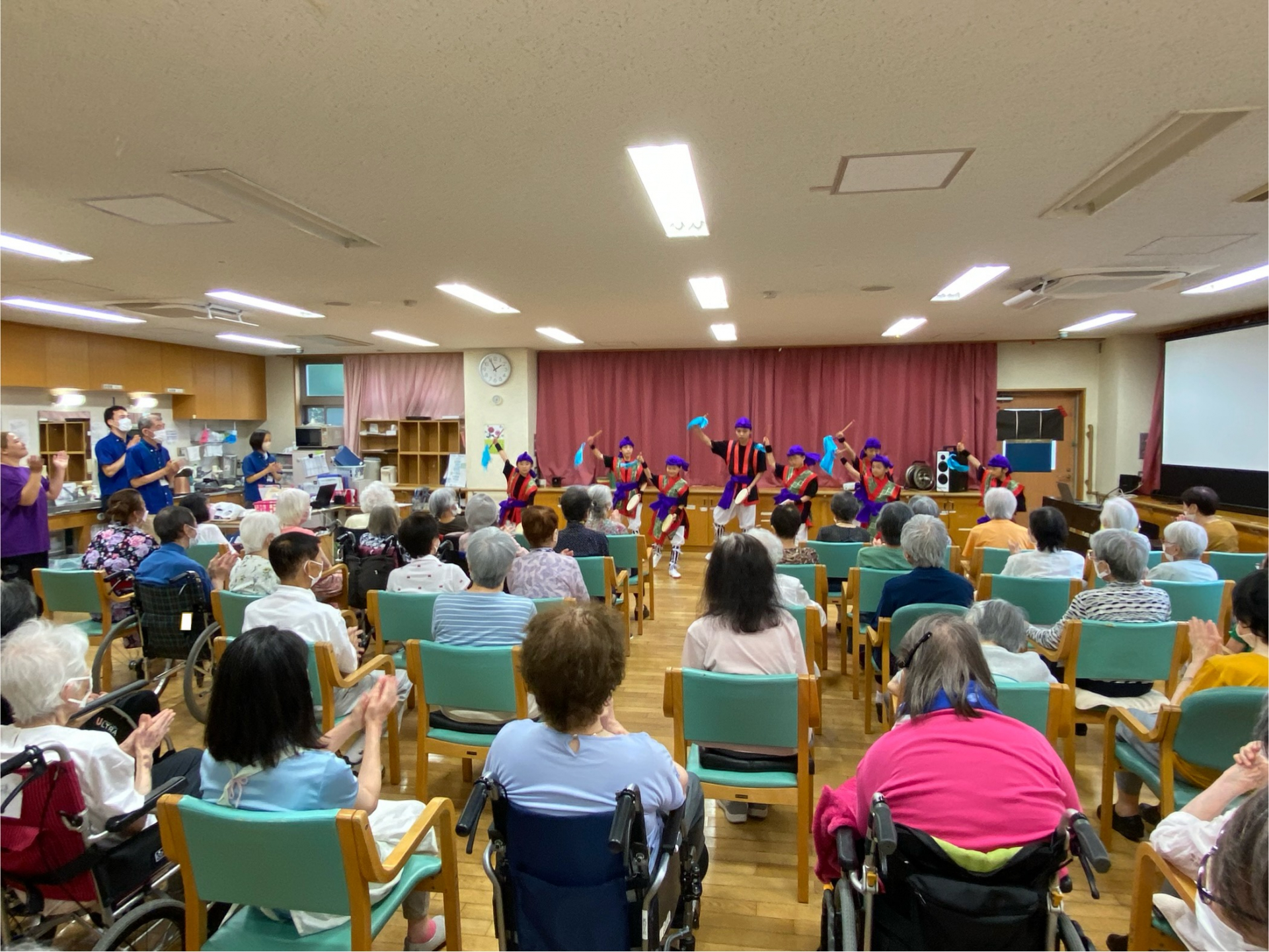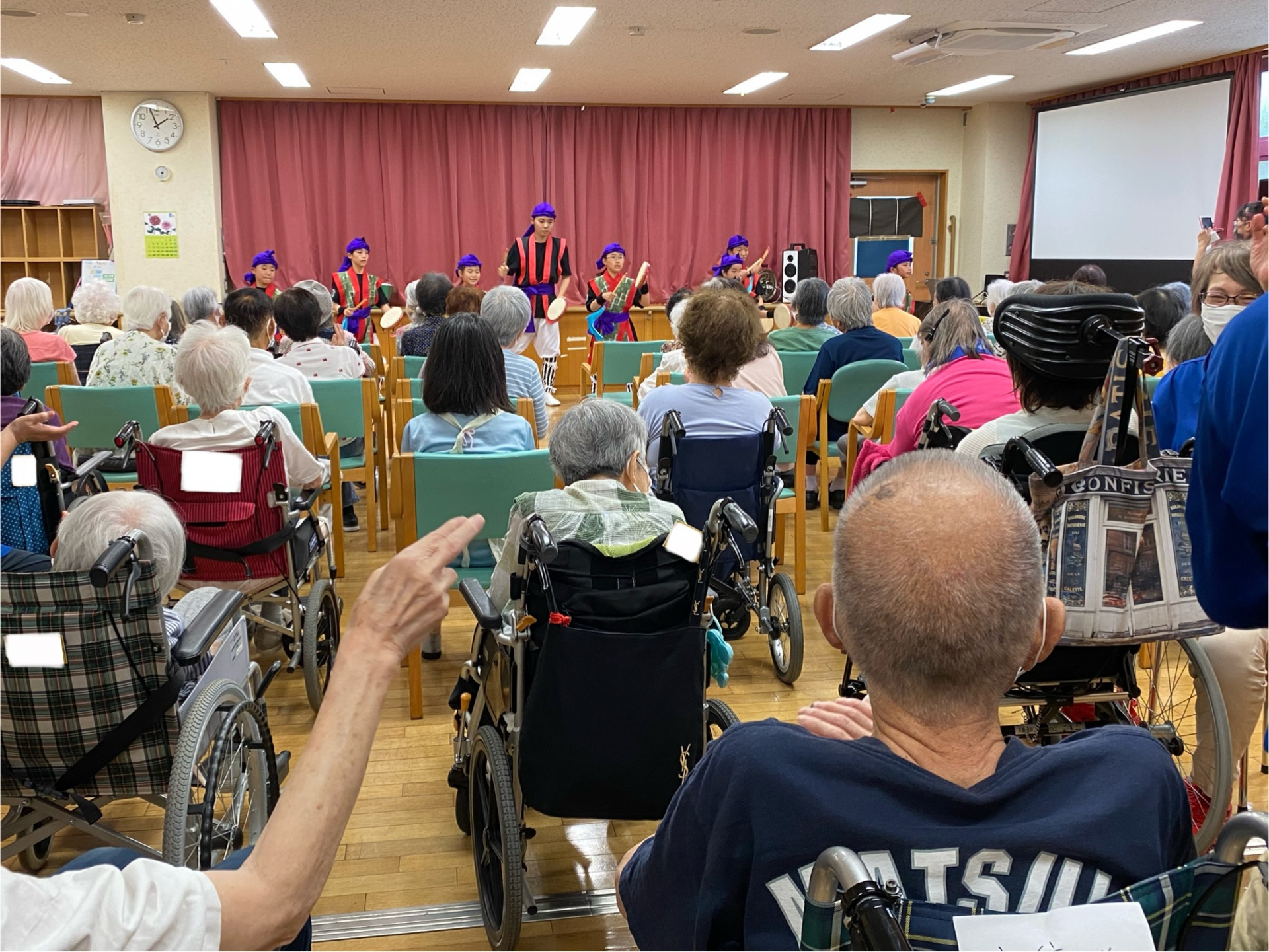 ラストの2曲はエイサー太鼓を数名の利用者様にも叩いていただき盛り上がった演舞会となりました。