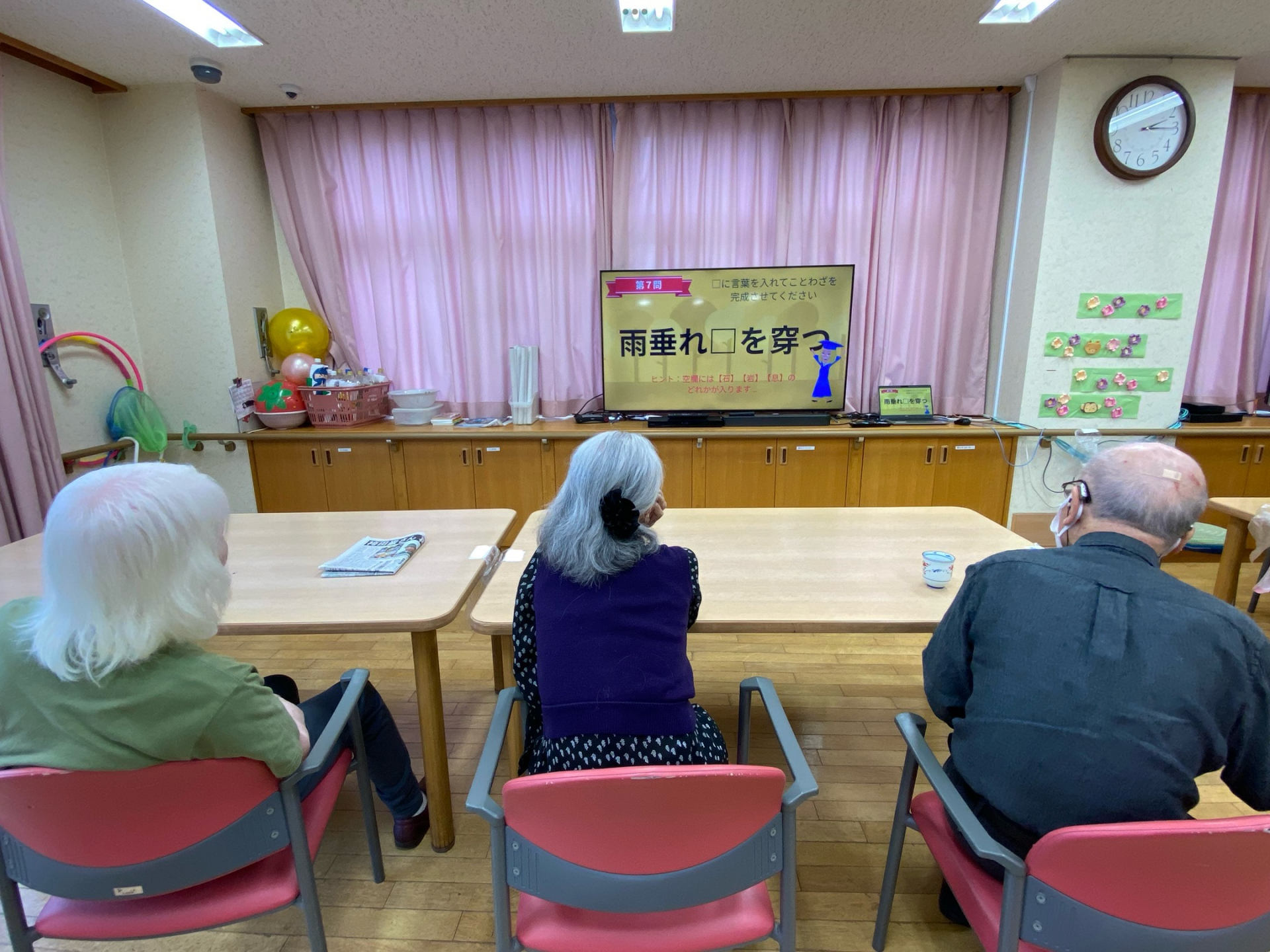 頭を覚醒させるべくことわざクイズに挑戦。「桃 栗 三年…」に続き柿八年と大きな声が出ていました。