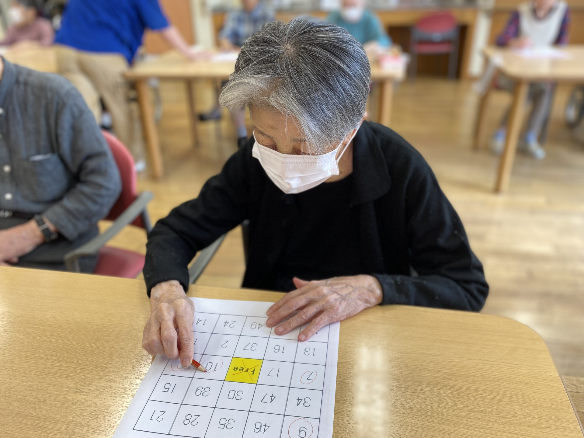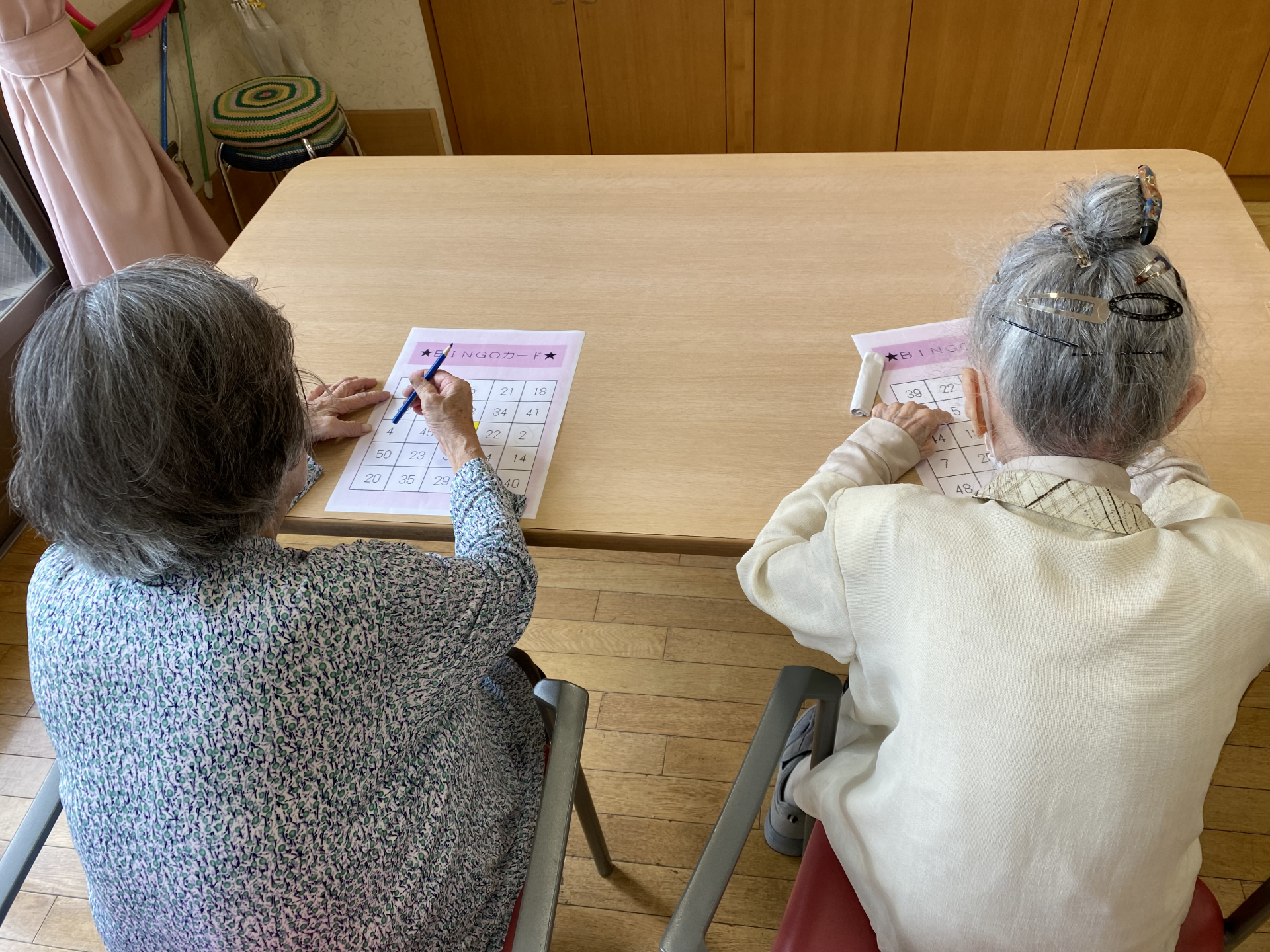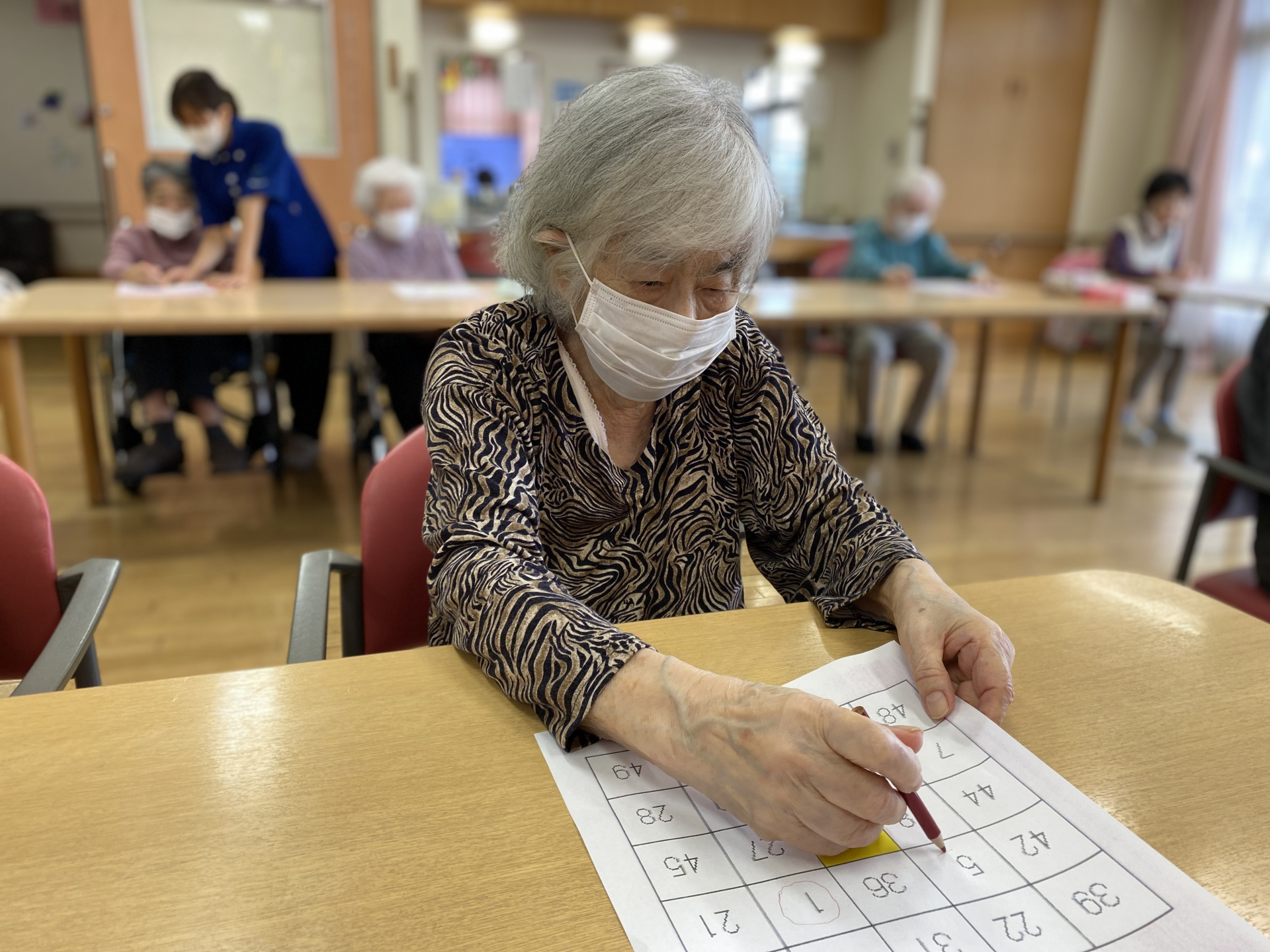 本日は「1」から「50」まで順番に読み上げて行くと、次は「〇番ね」と消す場所に鉛筆をスタンバイして数字を探しております。
