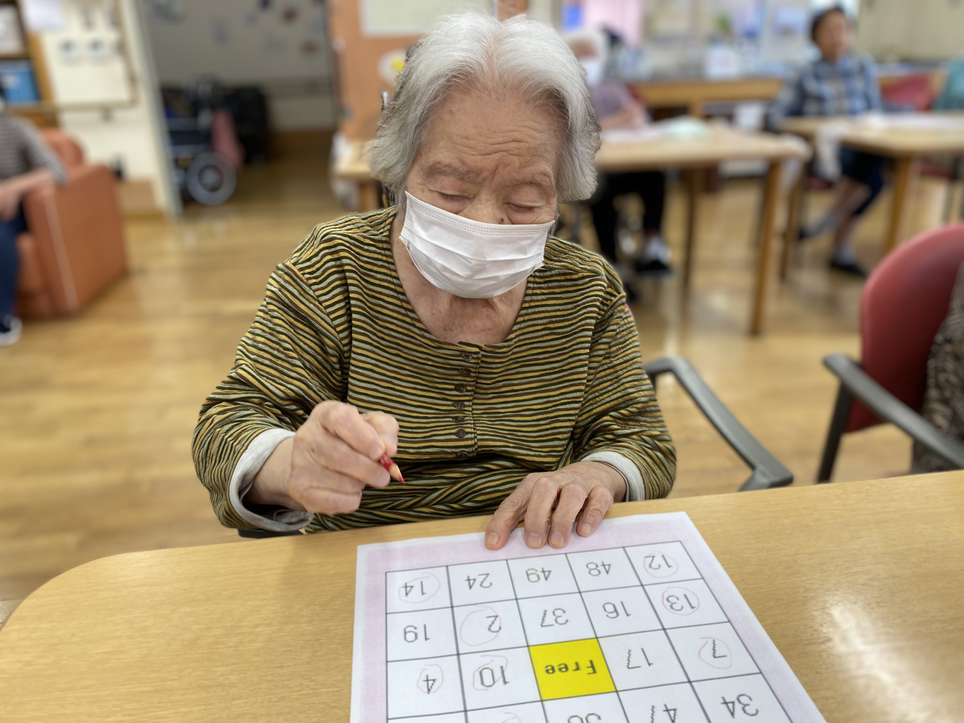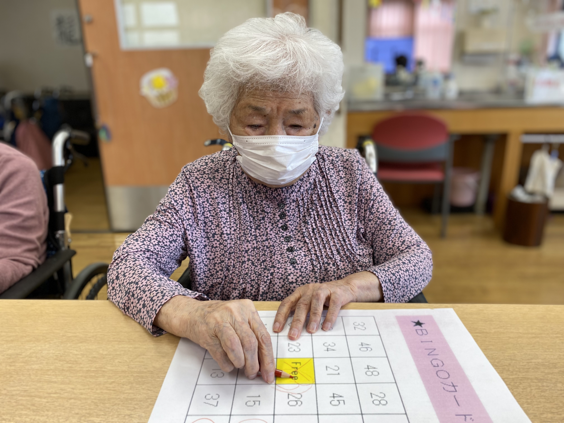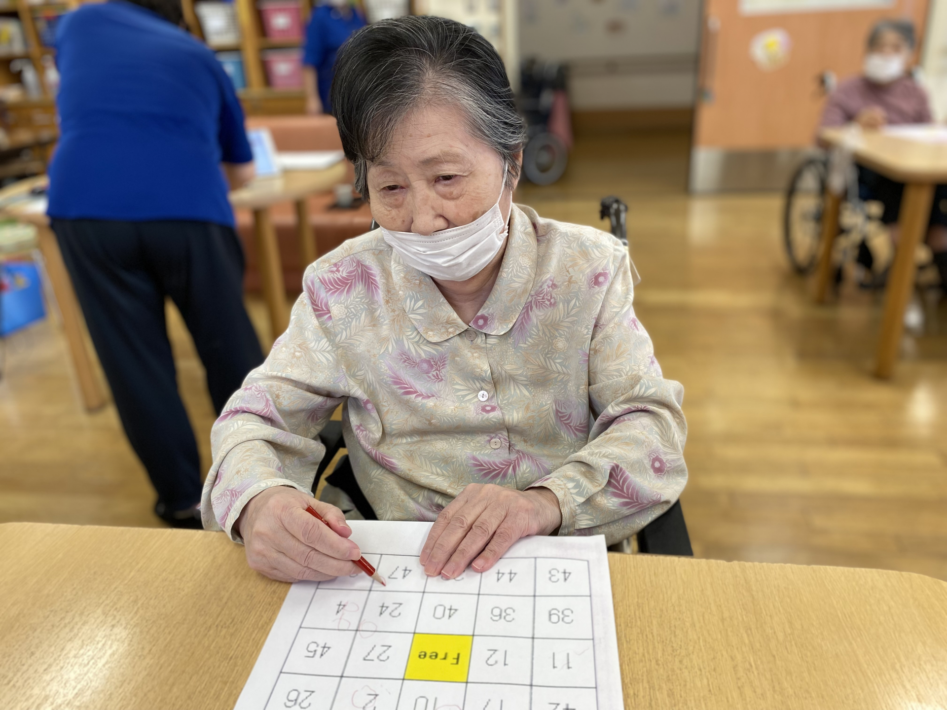 本日は「1」から「50」まで順番に読み上げて行くと、次は「〇番ね」と消す場所に鉛筆をスタンバイして数字を探しております。