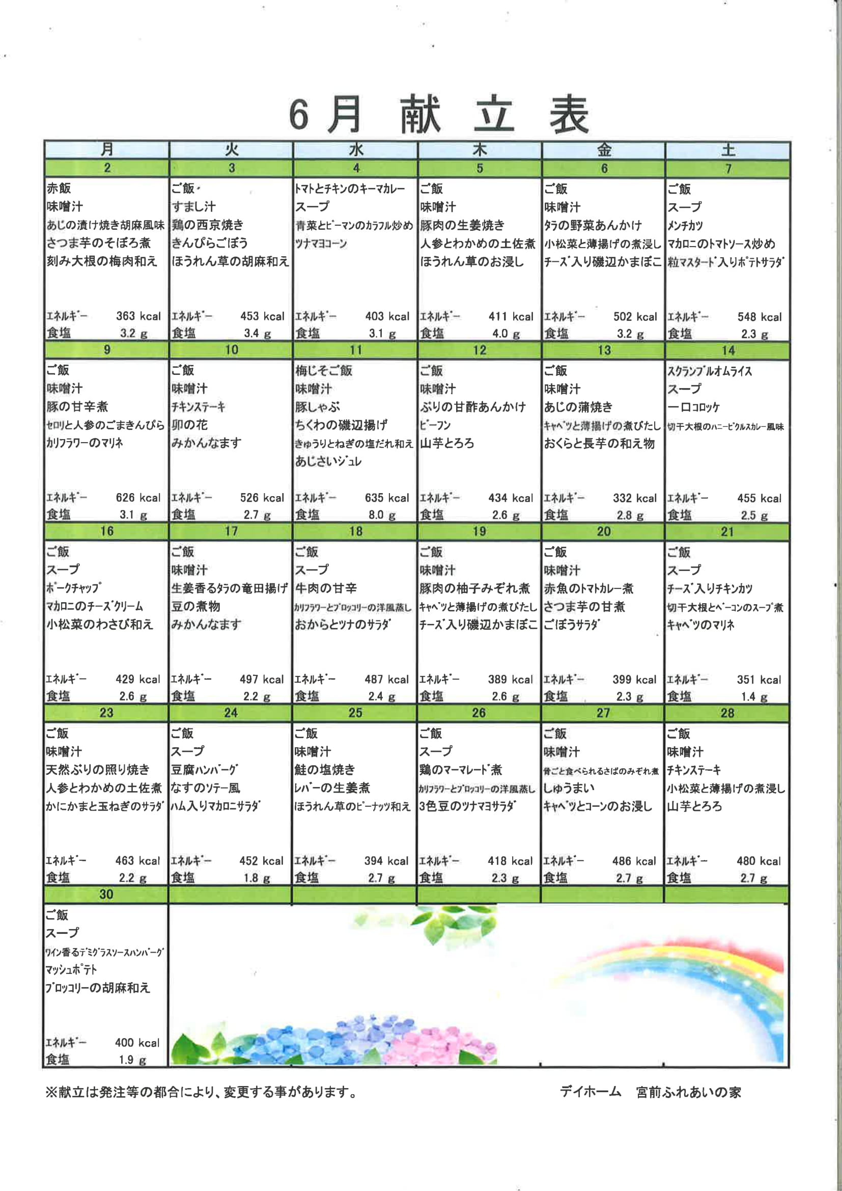 2025.06.02 お知らせ 6月の献立表 Tweet シェアする 宮前ふれあいの家、6月の献立表です。 今月も季節を感じるメニューを取り揃えてみなさんのご利用をお待ちしています。 生活相談員 S 前の記事 2025.06.02 お知らせ 6月の予定表 次の記事 2025.05.31 お知らせ フラダンスショーの模様 一覧へ戻る