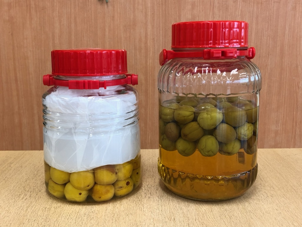 先週の「調理プログラム」で作業した、「梅ジュース」と「梅干し」の様子です。