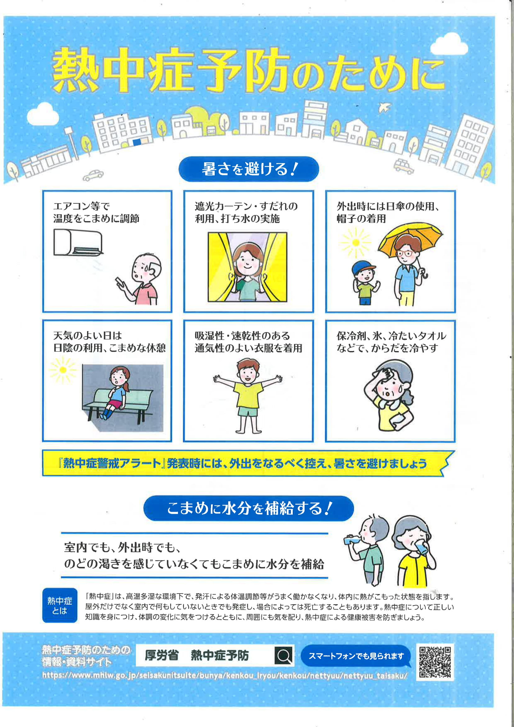 2025.06.20 ニュース 熱中症予防のために Tweet シェアする 厚生労働省より、「熱中症予防のために」のポスターが届きましたのでご紹介いたします。 厚生労働省ホームページ:heat stroke flyer_OK ol 1225 生活相談員 S 前の記事 2025.06.20 ニュース 熱中症に気を付けよう! 次の記事 2025.06.20 ニュース 見守り新鮮情報 一覧へ戻る