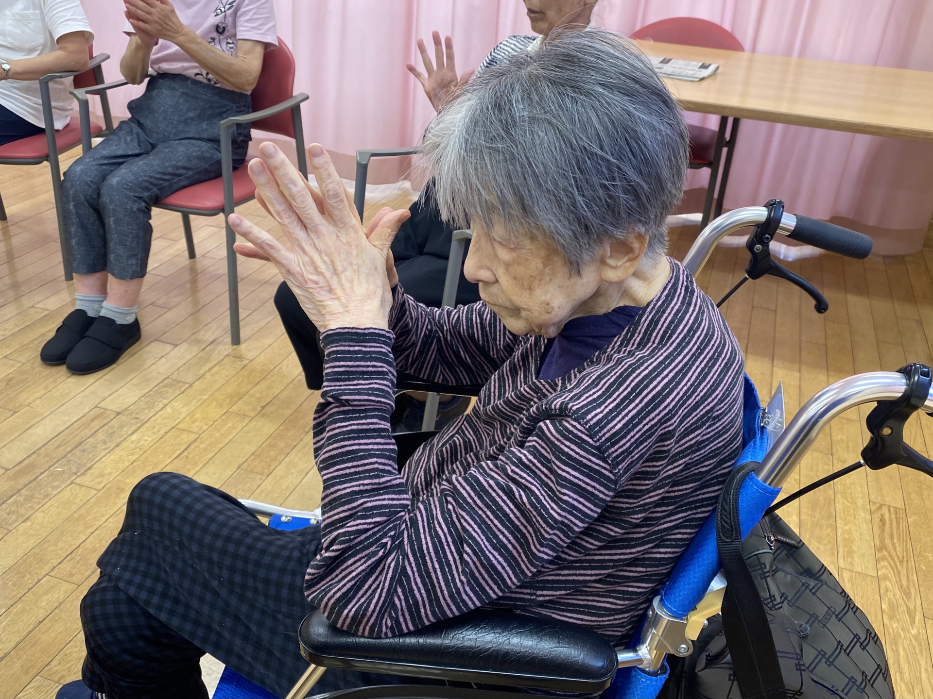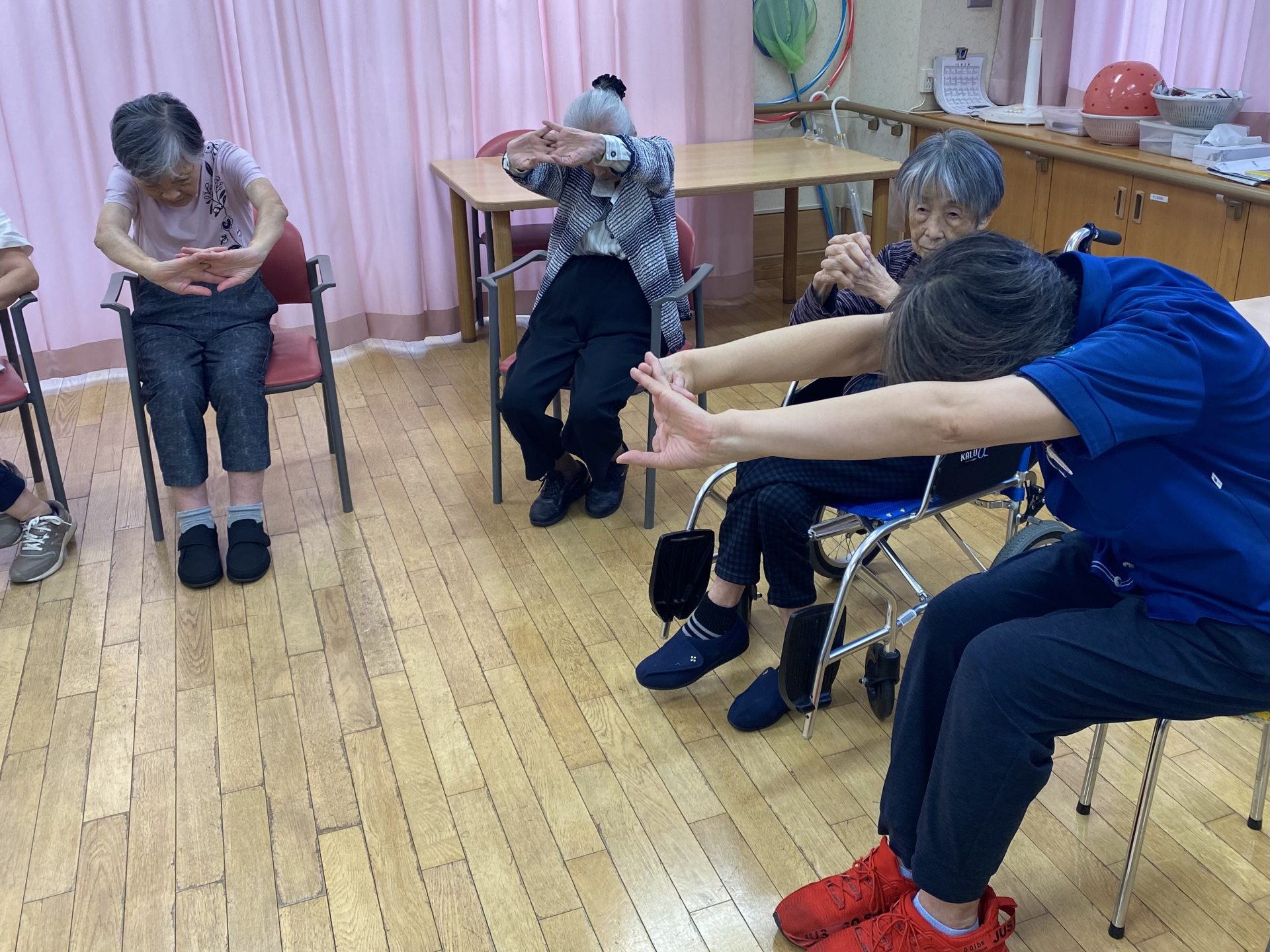 本日の午後は、皆様で輪になり、座ったままできる体操プログラムを実地しました。