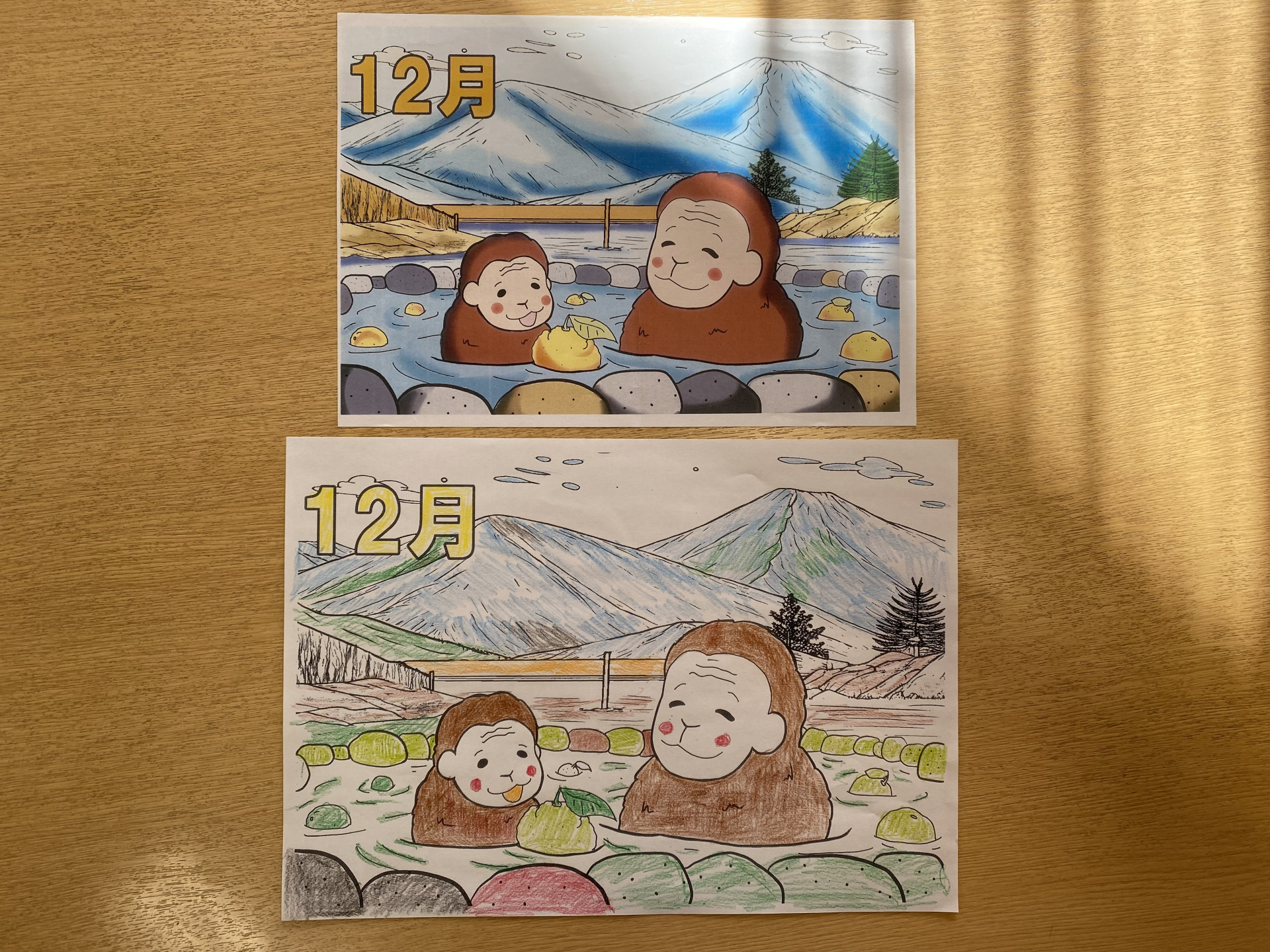 本日F様は、「12月の塗り絵」に取り組まれていました。見本を参考にしながら、集中して色を塗られていました。