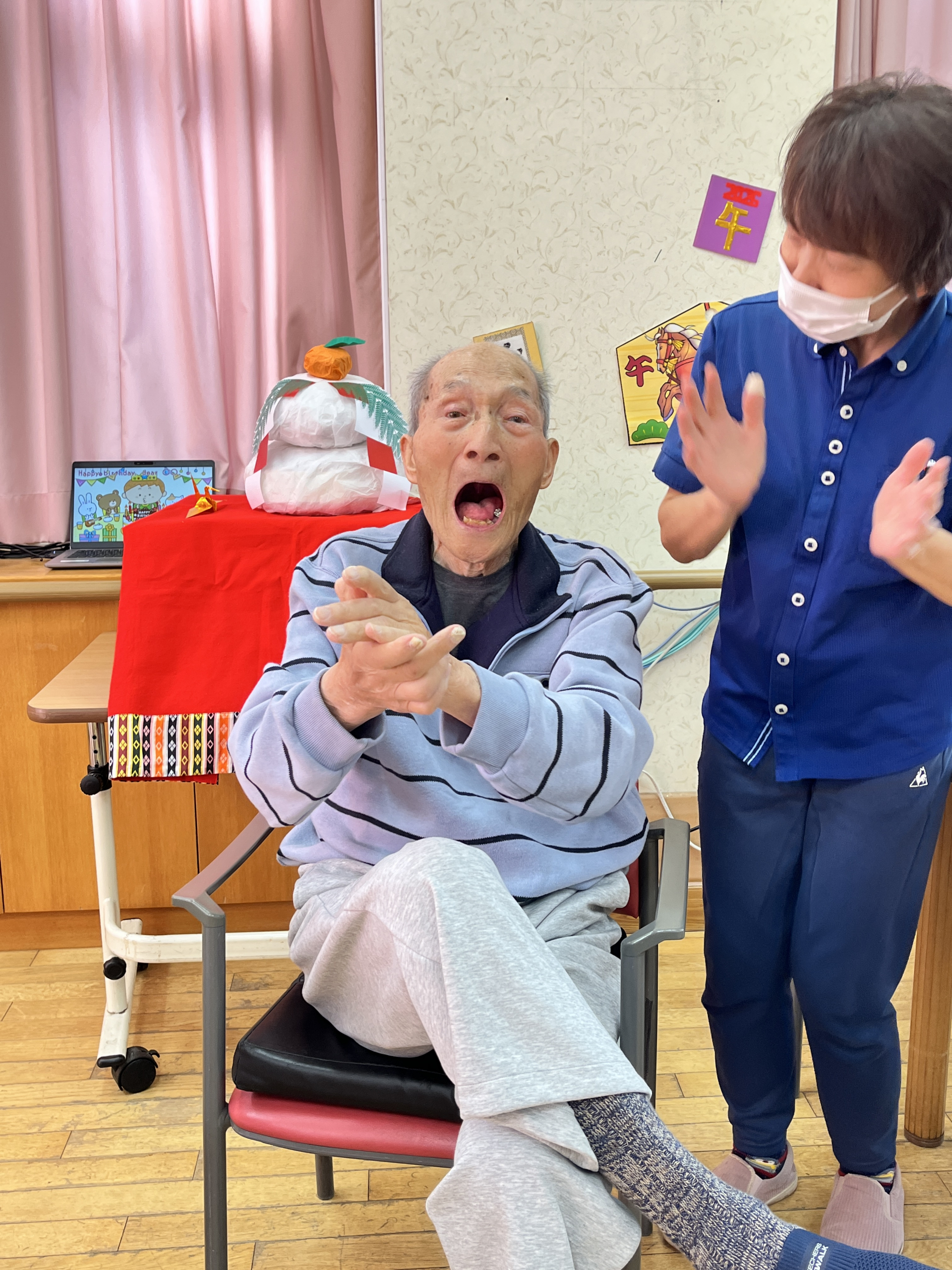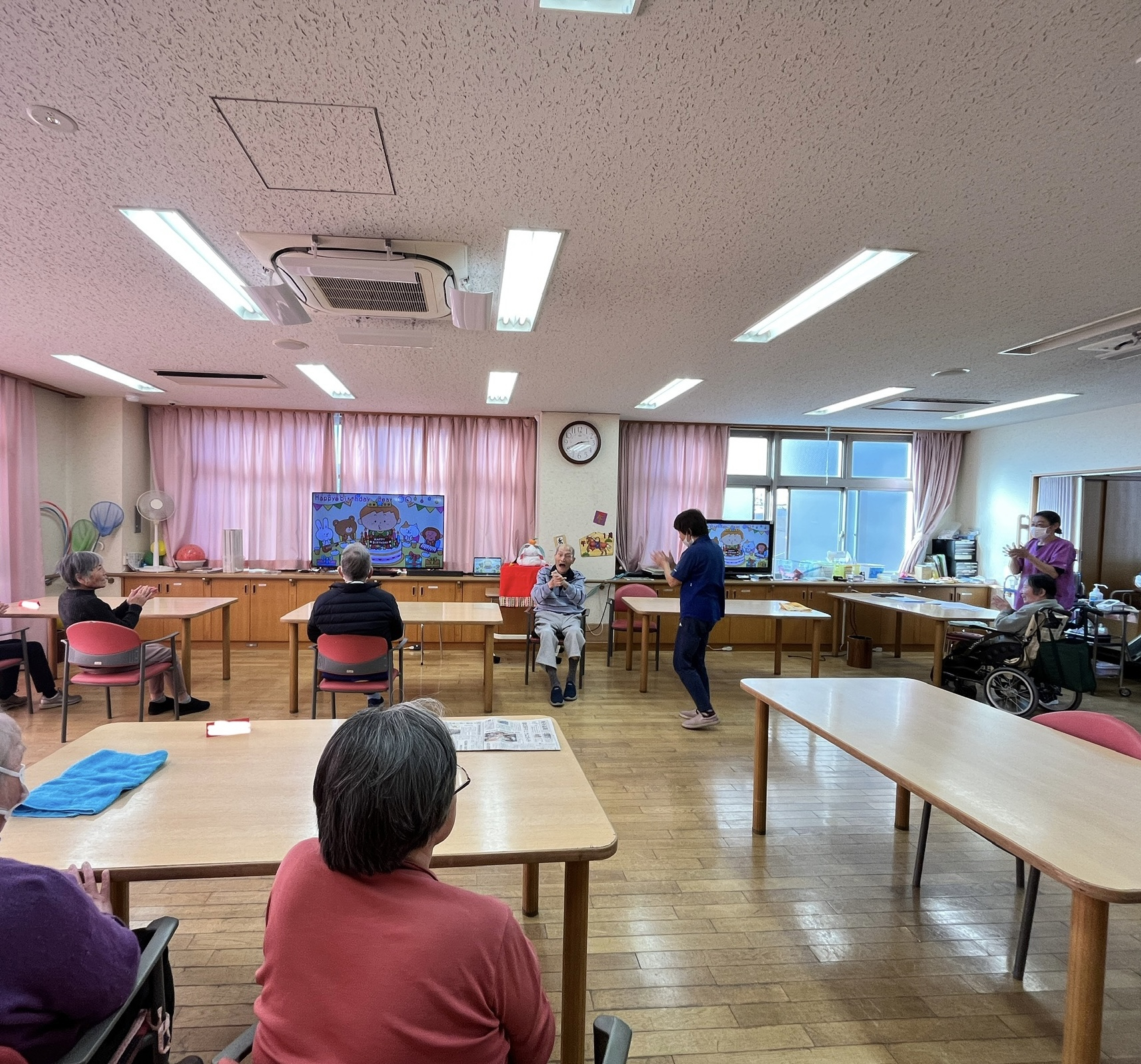 利用者と職員でハッピーバースデー歌を歌ってお誕生日をお祝いました♪