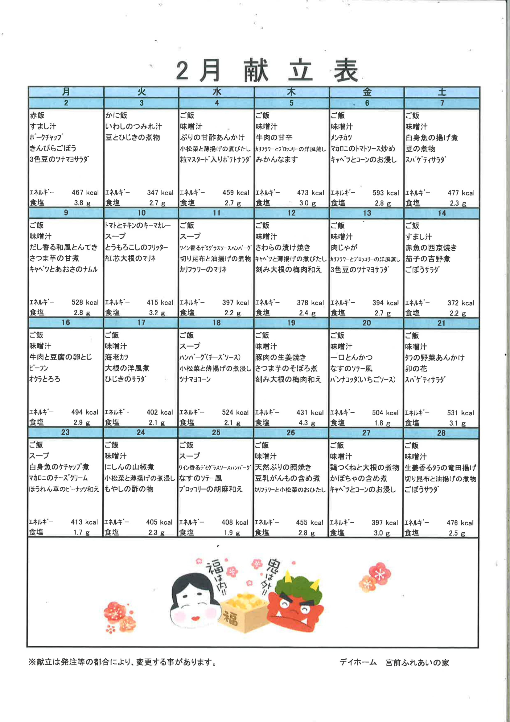 2026.01.31 お知らせ 2月の献立表 Tweet シェアする 宮前ふれあいの家、2月の献立表です。 来月も季節を感じるメニューを取り揃えてみなさんのご利用をお待ちしています。 生活相談員 S 前の記事 2026.01.31 お知らせ 2月の予定表 次の記事 2026.01.29 お知らせ 見守り新鮮情報 一覧へ戻る