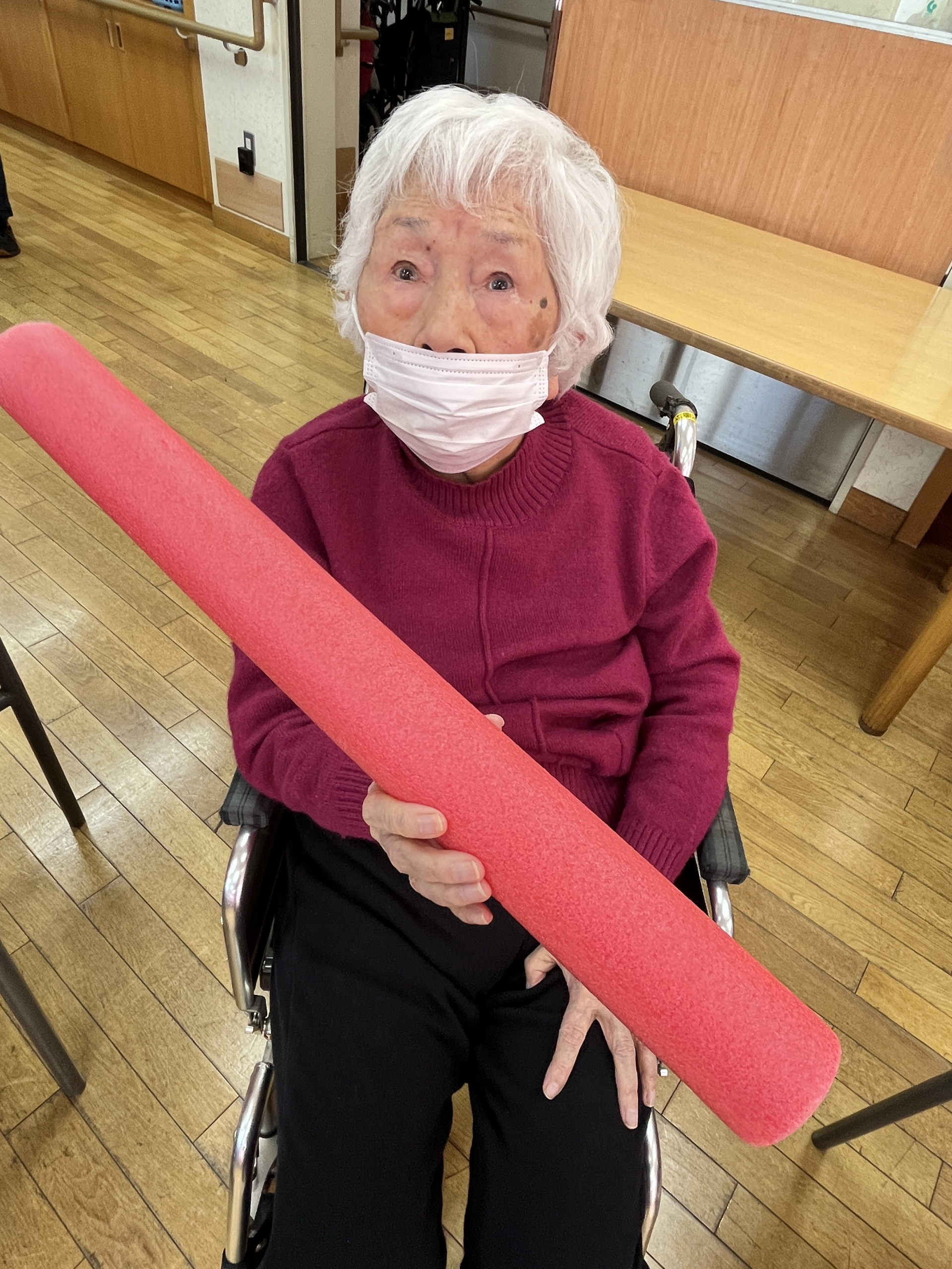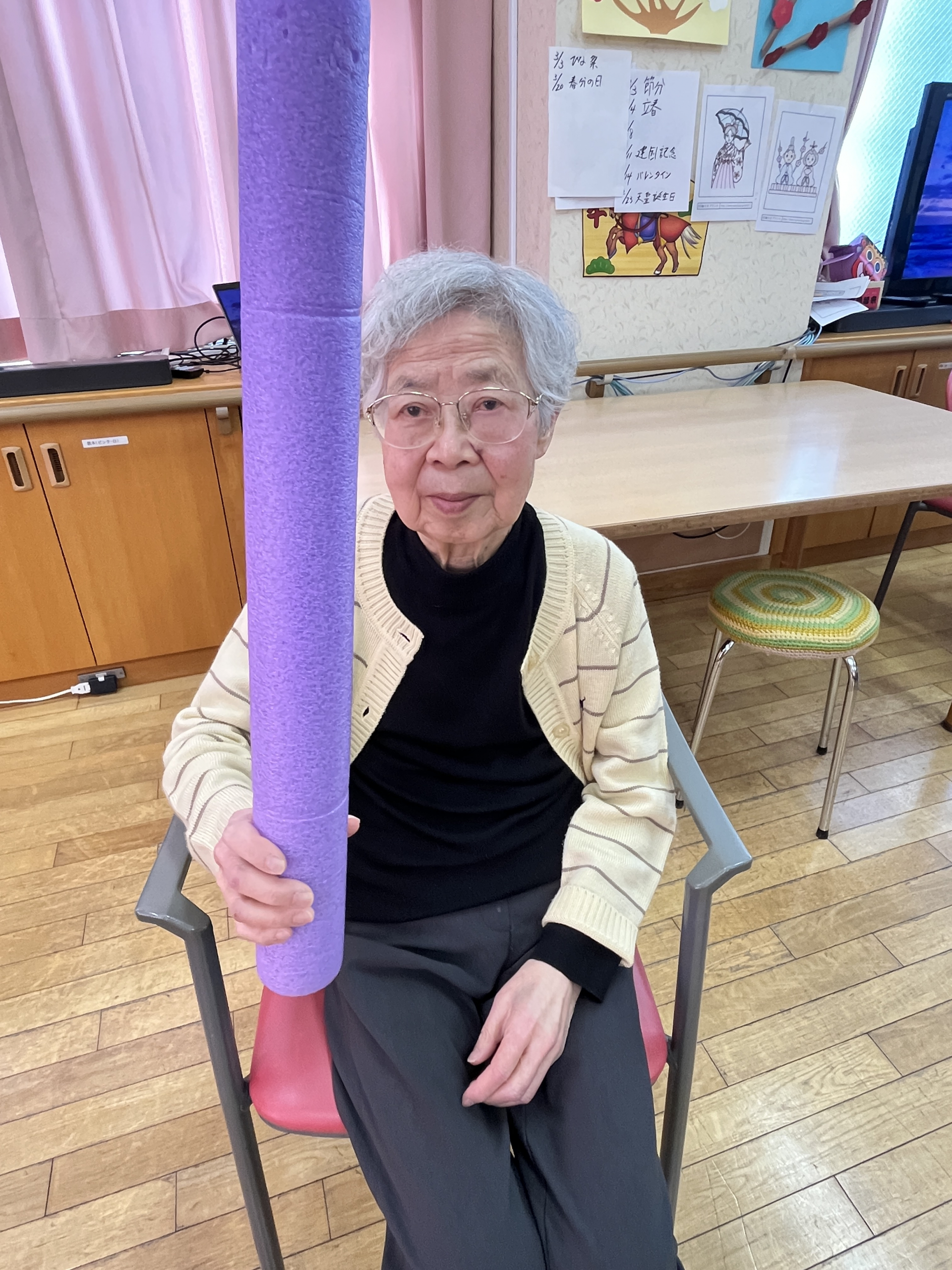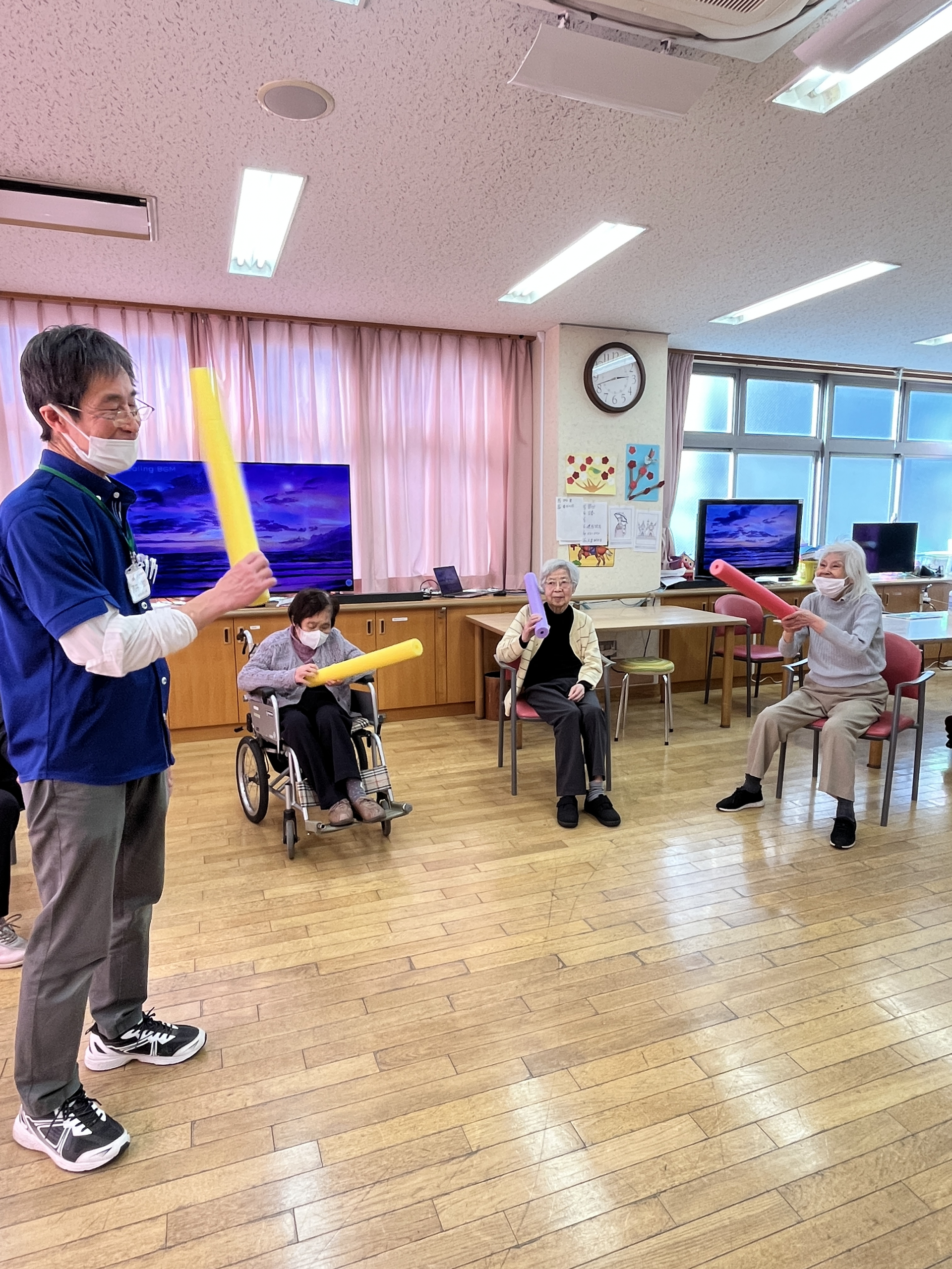 本日は「カラーポール」を使って体操とゲームを行っています。