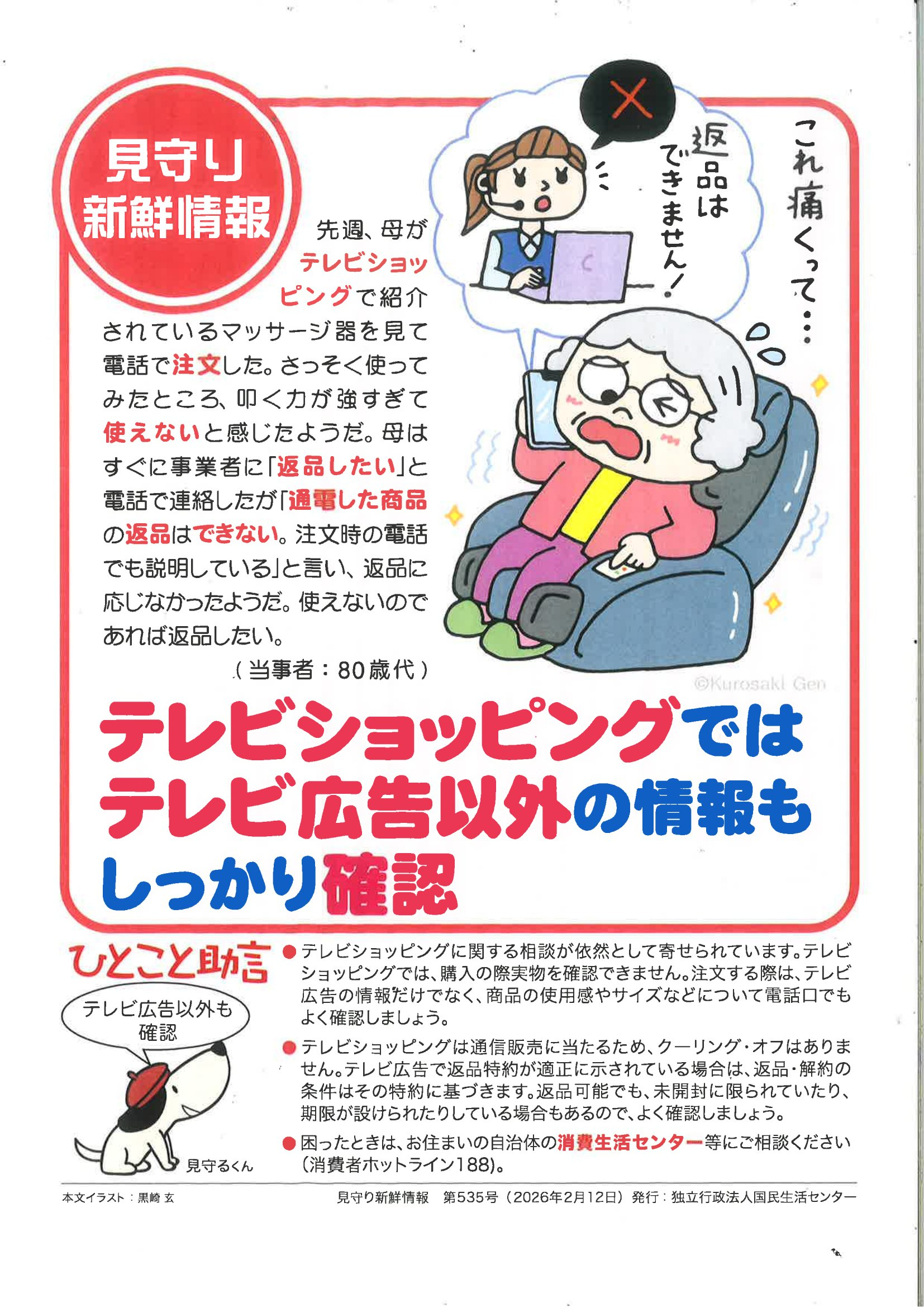 2026.02.14 ニュース 見守り新鮮情報 Tweet シェアする 独立行政法人国民生活センターより、「見守り新鮮情報 第535号」が発行されました。 テレビショッピングではテレビ広告以外の情報もしっかり確認 生活相談員 S 前の記事 2026.02.17 ニュース ちぎり絵『桜の花びら』 次の記事 2026.02.13 ニュース 午後のプログラム 一覧へ戻る