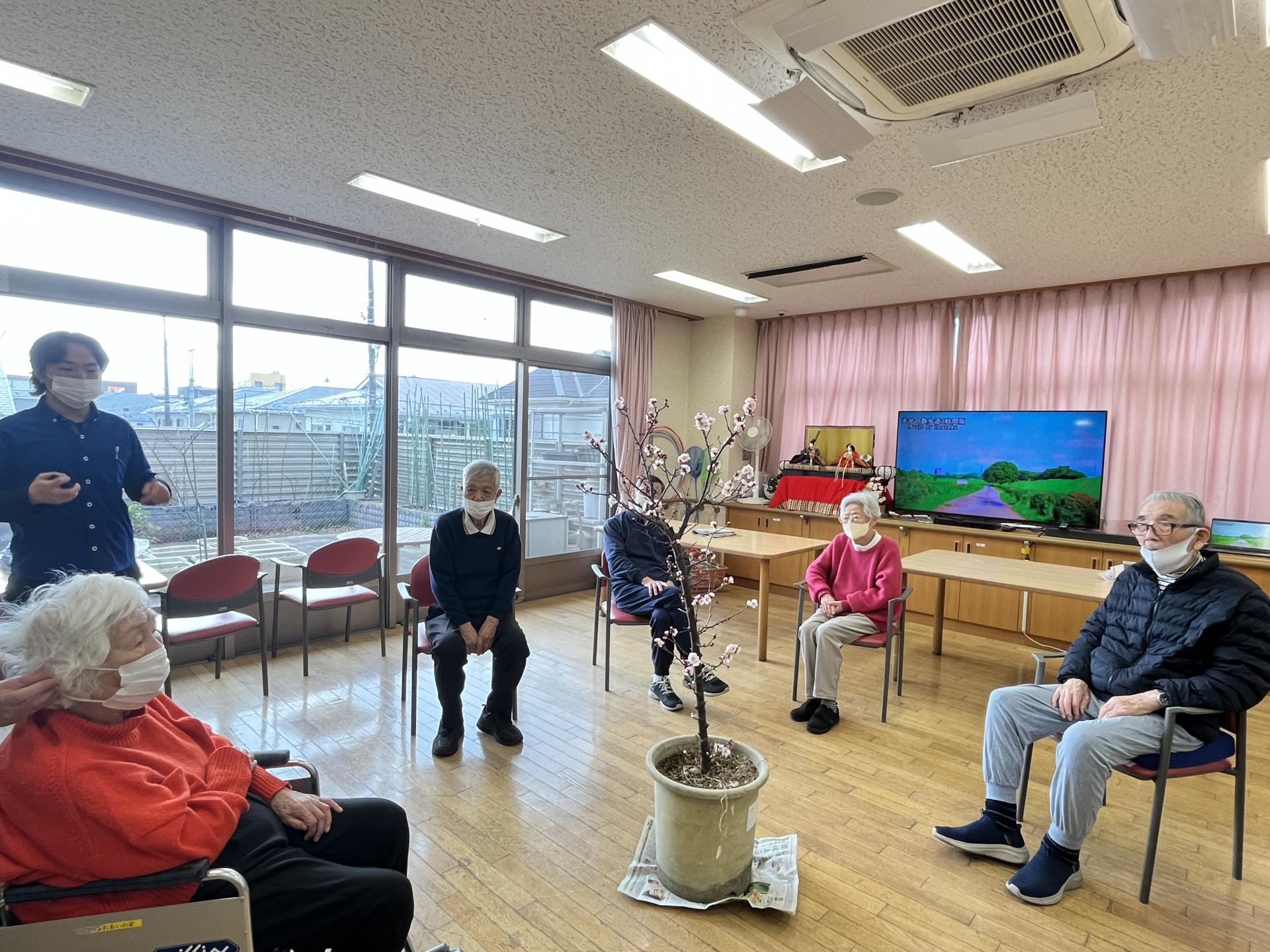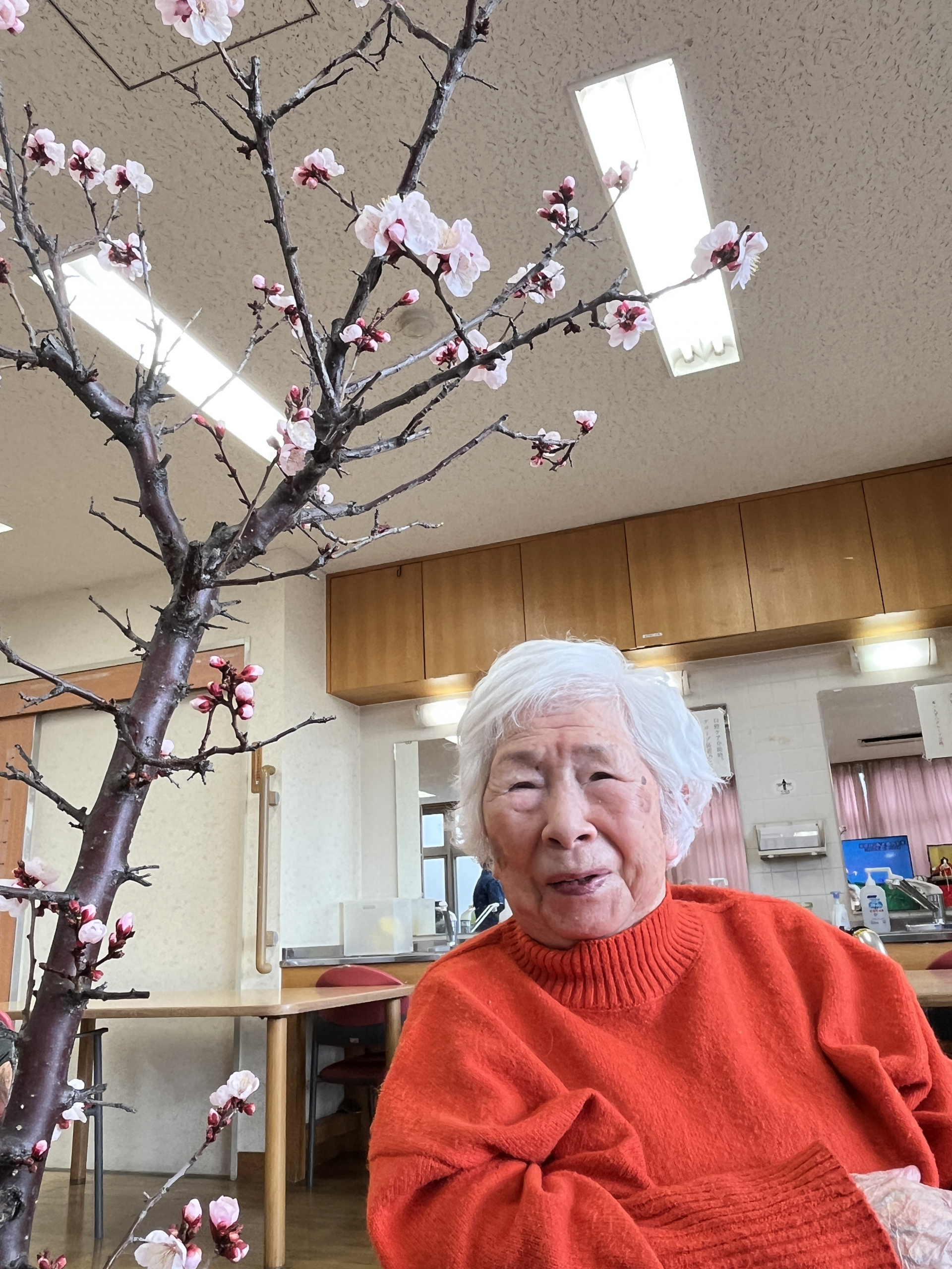 本日、午後のプログラムの時、利用者様は一人ずつで梅の花と記念写真を撮りました。!
