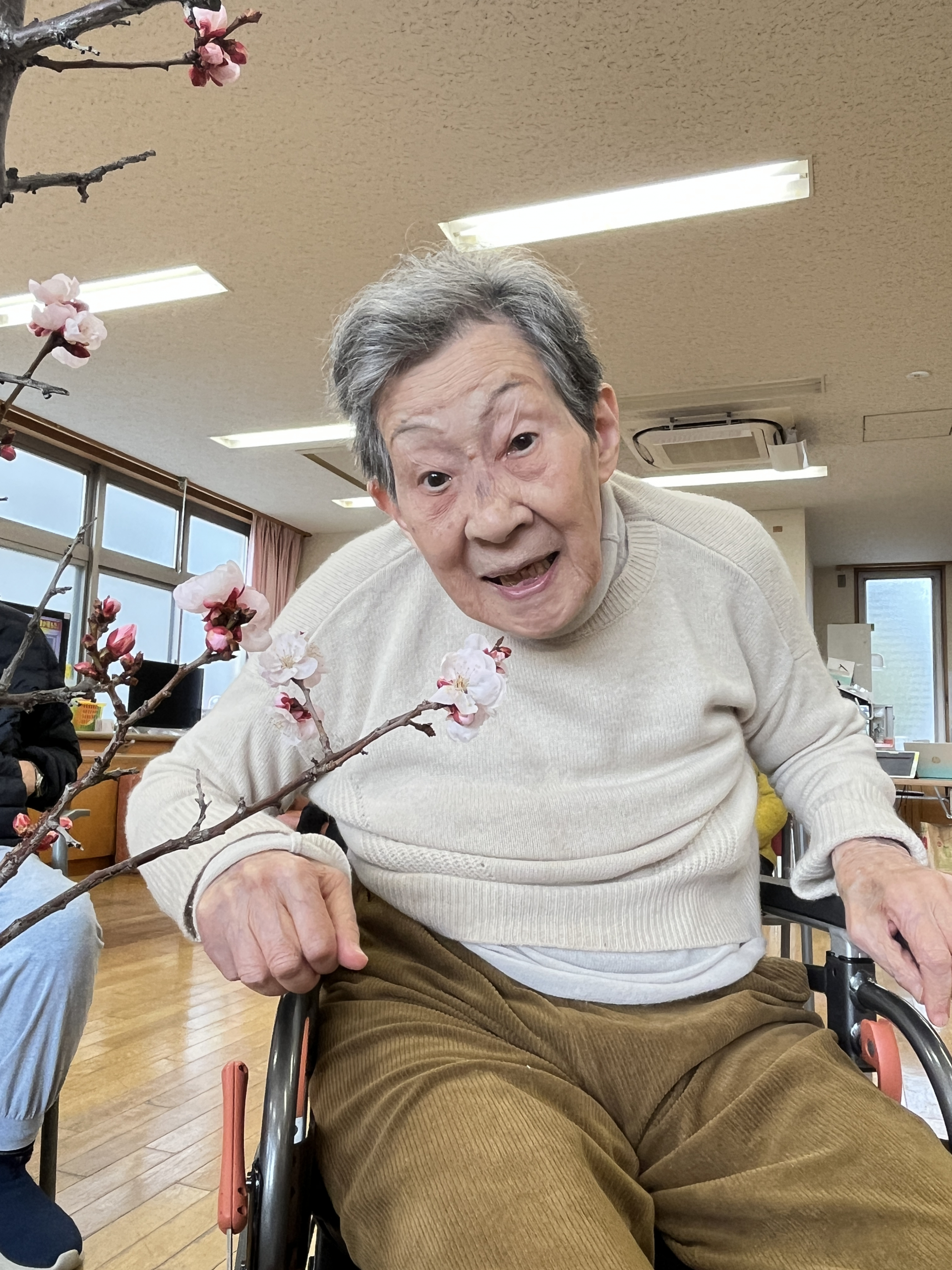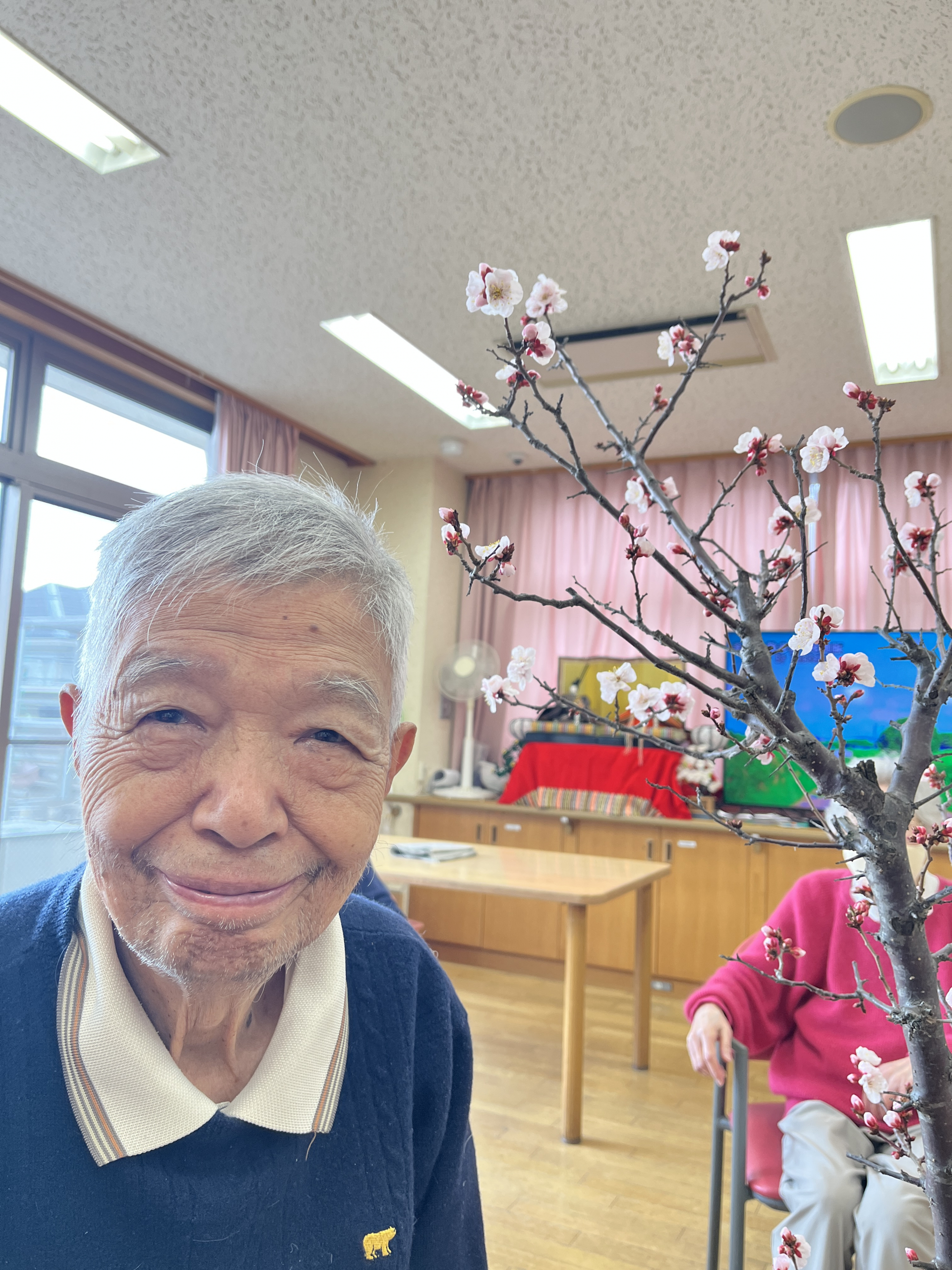 本日、午後のプログラムの時、利用者様は一人ずつで梅の花と記念写真を撮りました。!