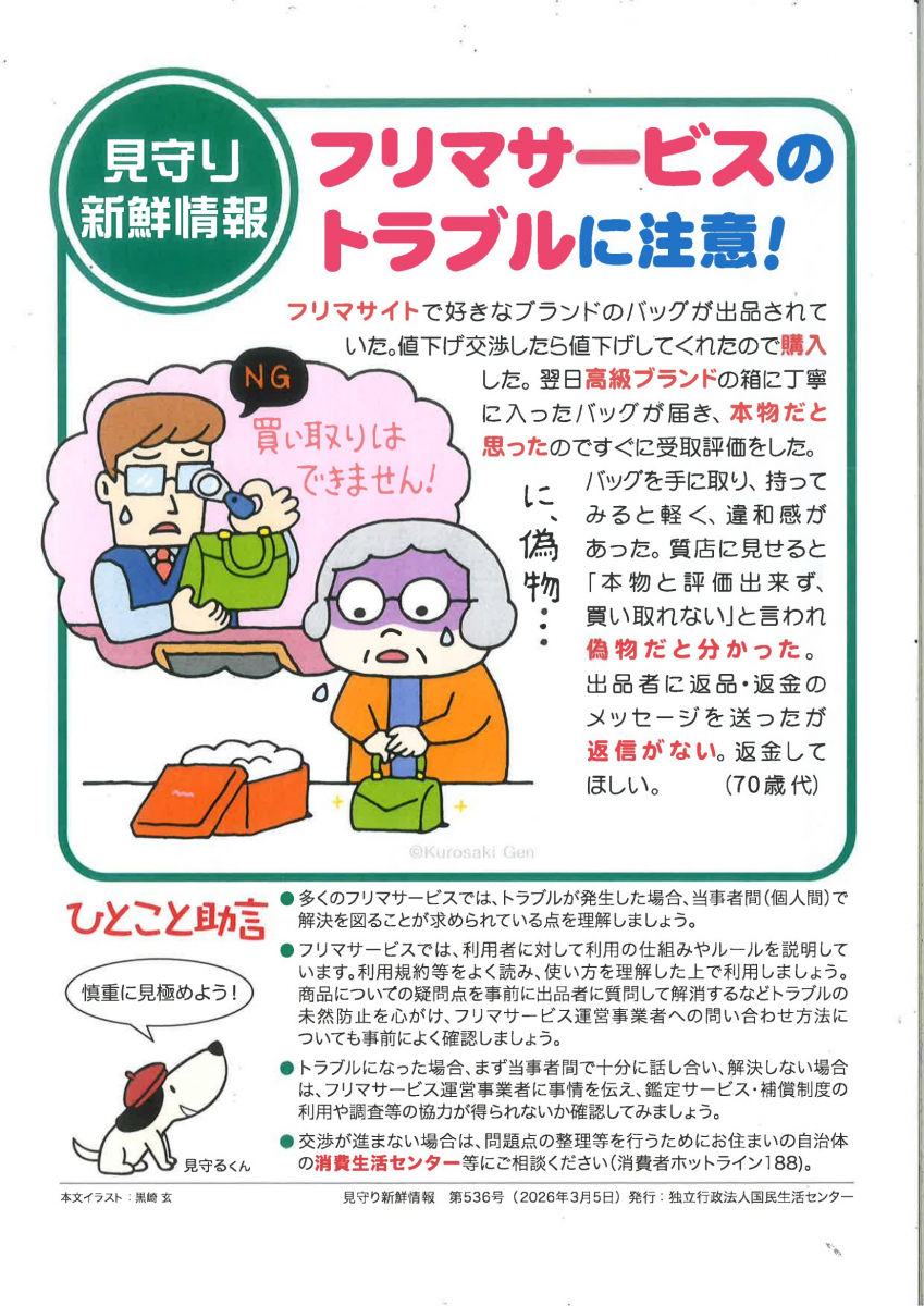 2026.03.07 活動報告 見守り新鮮情報 Tweet シェアする 独立行政法人国民生活センターより、「見守り新鮮情報 第536号」が発行されました。 フリマサービスのトラブルに注意! 生活相談員 S 前の記事 2026.03.07 活動報告 ビーチボールゲーム! 次の記事 2026.03.06 活動報告 本日のご様子☺️ 一覧へ戻る