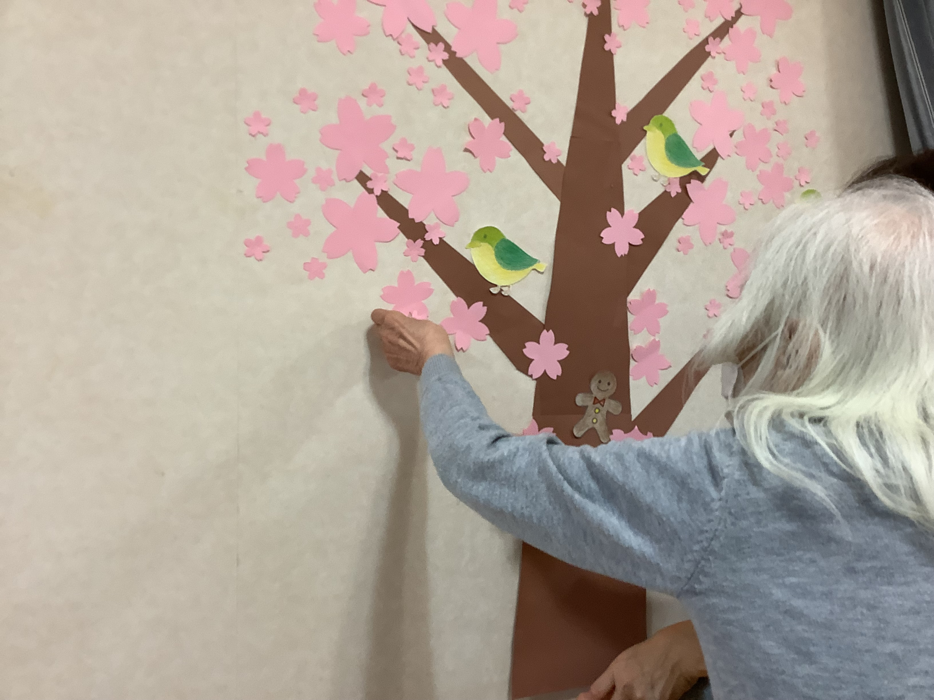 さて、本日は廊下の壁の桜の木に利用者様に協力して貰い、桜の花びらを貼っていただきました!