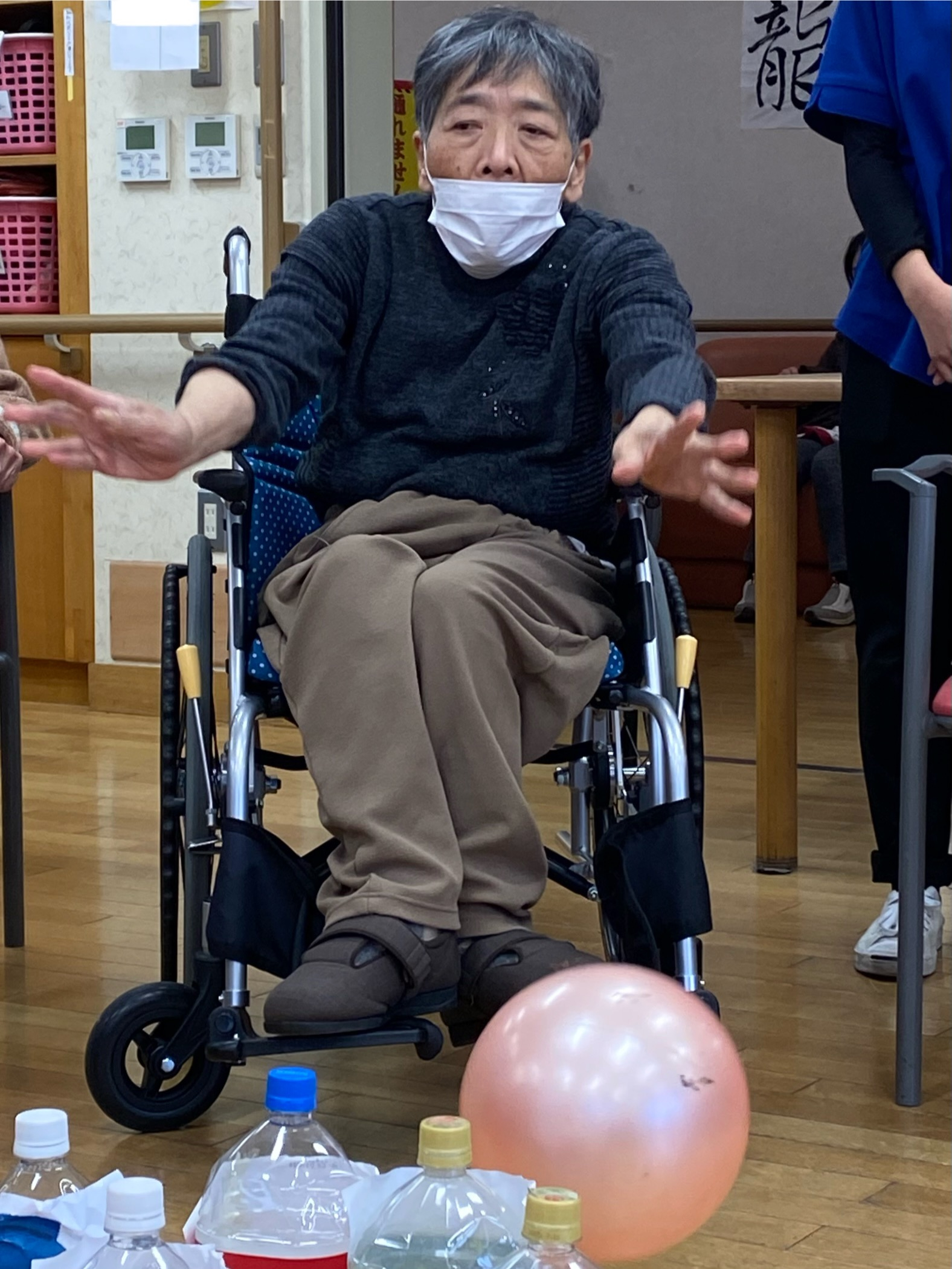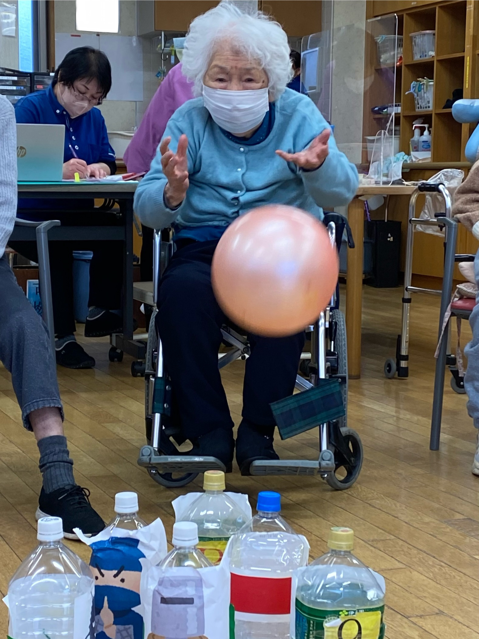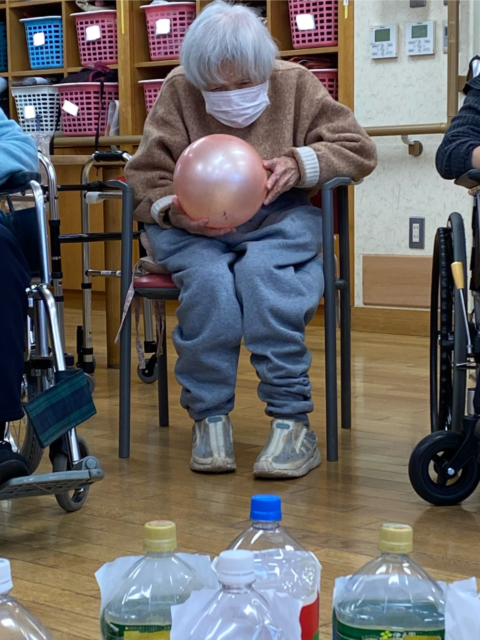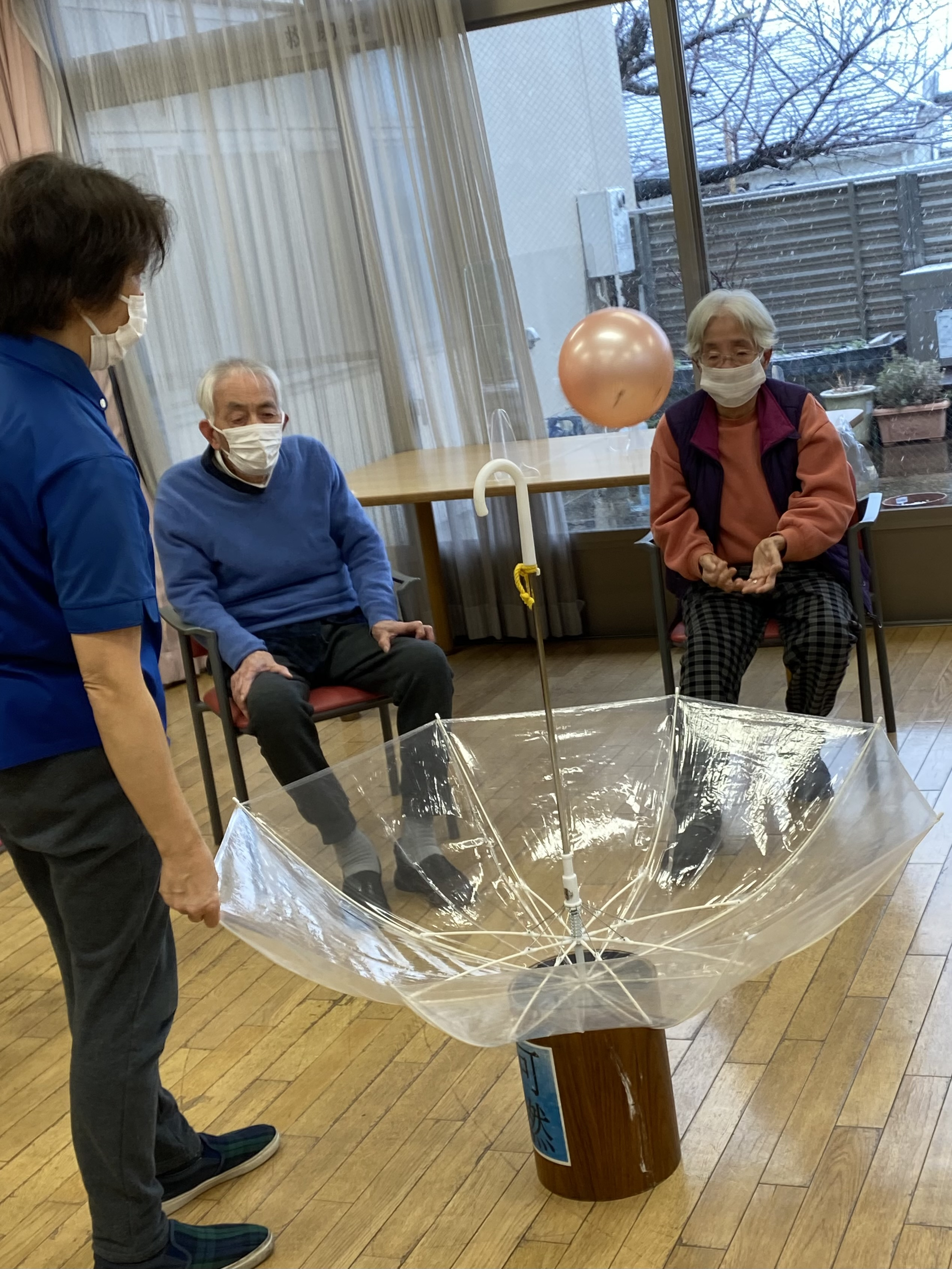 傘の中にボール体操で使うゴムボールを放り込みます。
