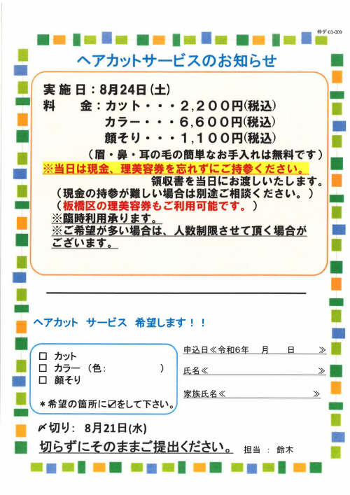 2025.08.29 【仲町在セン】8月手工芸~紙コップで作る、跳ねるうさぎ~② 活動報告 #仲町高齢者在宅サービスセンター #奉優会 #板橋区 #デイサービス #8月 #手工芸 2025.08.29 【仲町在セン】8月手工芸~紙コップで作る、跳ねるうさぎ~ 活動報告 #仲町高齢者在宅サービスセンター #奉優会 #板橋区 #デイサービス #8月 #手工芸 2025.08.12 【仲町在セン】出前昼食~うなぎちらし弁当~③ 活動報告 #仲町高齢者在宅サービスセンター #奉優会 #板橋区 #デイサービス #8月 #出前昼食 #うなぎちらし弁当 2025.08.12 【仲町在セン】出前昼食~うなぎちらし弁当~② 活動報告 #仲町高齢者在宅サービスセンター #奉優会 #板橋区 #デイサービス #8月 #出前昼食 #うなぎちらし弁当 2025.08.12 【仲町在セン】出前昼食~うなぎちらし弁当~① 活動報告 #仲町高齢者在宅サービスセンター #奉優会 #板橋区 #デイサービス #8月 #出前昼食 #うなぎちらし弁当 2025.08.11 【仲町在セン】8月手工芸のお知らせです☆ 活動報告 #仲町高齢者在宅サービスセンター #奉優会 #板橋区 #デイサービス #8月 #手工芸 2025.08.04 【仲町在セン】8月ヘアカットサービスのお知らせです☆ 活動報告 #仲町高齢者在宅サービスセンター #奉優会 #板橋区 #デイサービス #8月 #ヘアカットサービス #訪問理美容 2025.07.29 【仲町在セン】8月出前昼食のお知らせです☆ 活動報告 #仲町高齢者在宅サービスセンター #奉優会 #板橋区 #デイサービス #出前昼食 #8月 #うなぎ 2025.07.18 【仲町在セン】8月スイーツケータリングのお知らせです☆ 活動報告 #奉優会 #仲町高齢者在宅サービスセンター #板橋区 #デイサービス #8月 #スイーツケータリング 2024.08.06 【仲町デイ】8月ヘアカットサービスのお知らせです☆ お知らせ #仲町高齢者在宅サービスセンター #奉優会 #ヘアカットサービス #8月 2024.07.26 【仲町デイ】8月手工芸のお知らせです♪~型抜きアート動物しおり~ お知らせ #奉優会 #仲町高齢者在宅サービスセンター #手工芸 #8月 2024.07.25 【仲町デイ】8月プログラム表です☆ お知らせ #奉優会 #仲町高齢者在宅サービスセンター #8月 #プログラム表 2024.07.25 【仲町デイ】8月献立表です☆ お知らせ #奉優会 #仲町高齢者在宅サービスセンター #8月 #献立表