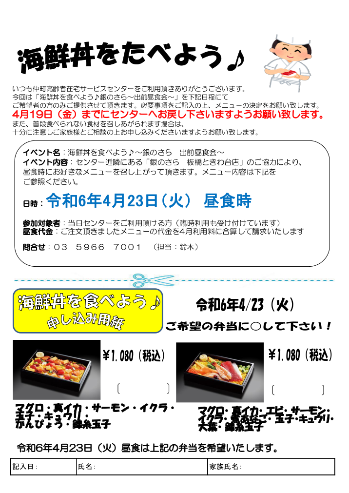 2024.04.05 活動報告 【仲町デイ】4月の出前昼食 Tweet シェアする こんにちは~仲町高齢者在宅サービスセンターです。 4月の出前昼食は仲町デイ人気ナンバーワンの・・・ 是非スポット利用ご活用くださ~い(*^^*) お待ちしております! 前の記事 2024.04.05 活動報告 【仲町デイ】4月の手工芸! 次の記事 2024.04.05 活動報告 【仲町デイ】4月献立表! 一覧へ戻る