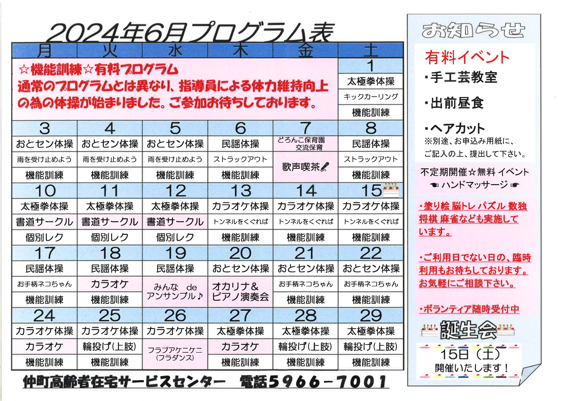 遅くなってしましたが、6月のプログラム表をご利用者様へ配布しております。